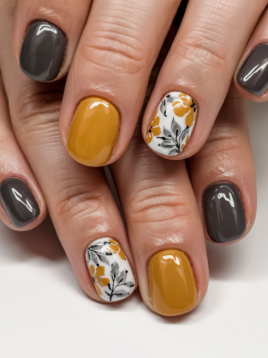These warm mustard shades and soft gray shades make this set the comfiest flannel shirt in nail form. The petal decor is the right amount of cute and emanates huge pumpkin spice and sunset hayride vibes. It’s modern, mature, and full of subtle sweetness.