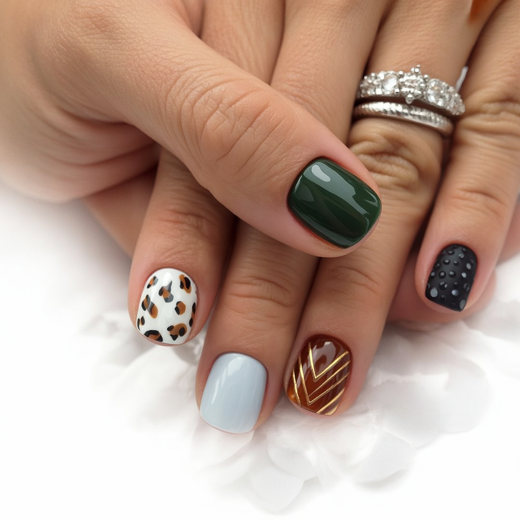 This is one nail set which would never be boring to look at- ex: animal prints, olive green, navy studded texture, rich amber nail striped with gold. It looks like a capsule of the best fall textures and tendencies, all summed together in one amazing nail art.