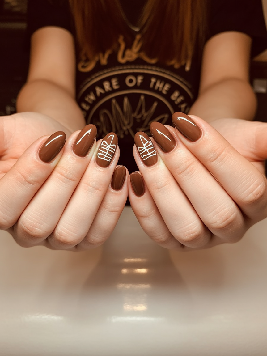 These abstract white lined cinnamon brown nails emit a clean western appeal, which is classy, mature and slightly mysterious. It is a fresh take on western style, but think broad hats with brims, stiff jackets and suede boots.