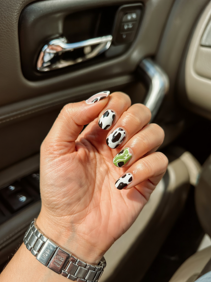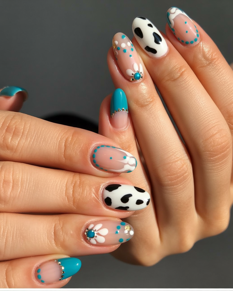 Daisies, cow spots, turquoise gems — this set is bursting with cowgirl flair and bright energy! This combination of the patterns and color pops is youthful, fresh, and it is designed with a person who does not take her manicure too seriously in mind.