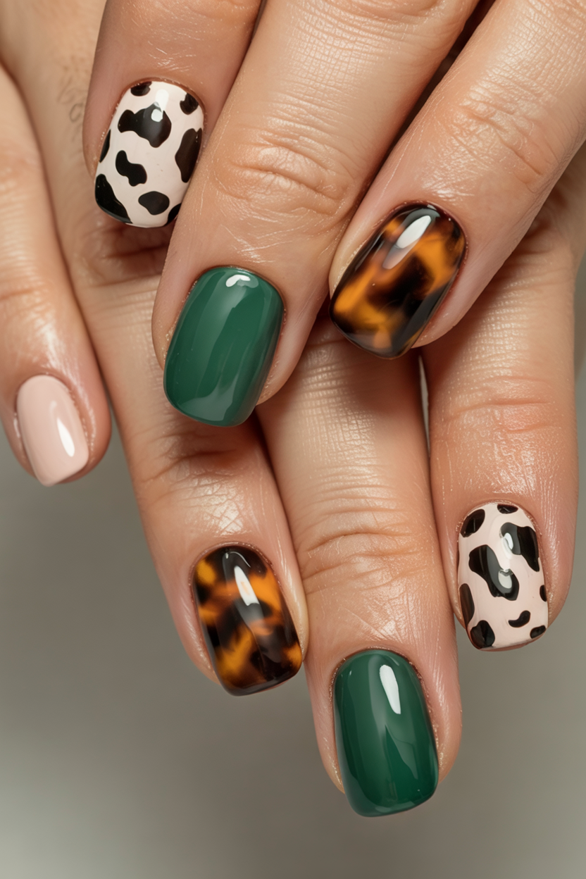 It is an ideal combination of western glamour tortoiseshell nails, forest green nail polish and cream cow print trimmings. It is deep, rooted and elegant, which is a twister of a designer handbag. Effortlessly stylish.