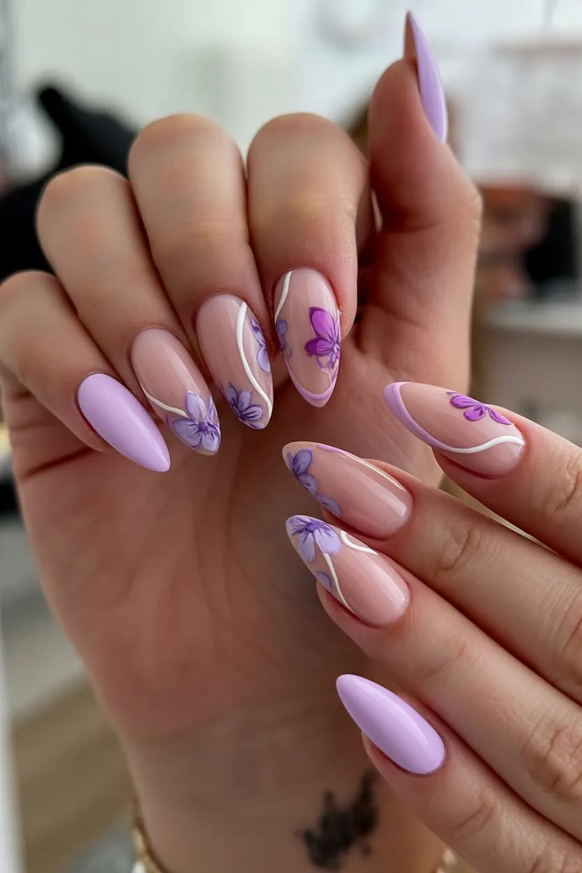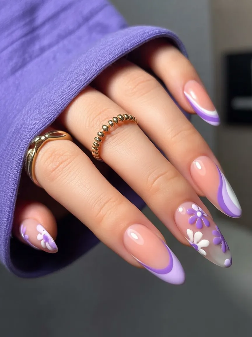 This design feels confident and put together, but with a little softness. The lavender, French outline is modern and flattering, and the floral art adds a touch of softness. It is artistic and stylish and great for the bold, but not too over the top. It is the type of design that quietly elevates your look.
