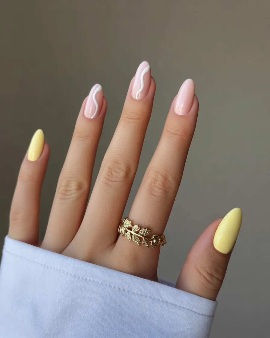 Soft nude nails with a surprise touch of pastel yellow is something quietly joyful about this combination. It feels modern, light, and a little unexpected, like adding a colorful scarf to a neutral outfit. The overall effect is clean but not boring, with a hint of playfulness.