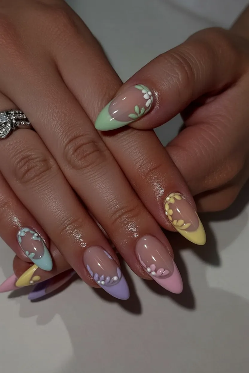 Spring spark nails the almond shape goes well with both short and long nails. The design is approachable with soft spring colors. It is fun, fresh, and elegant. It a design that definitely inspires excitement for the spring season.