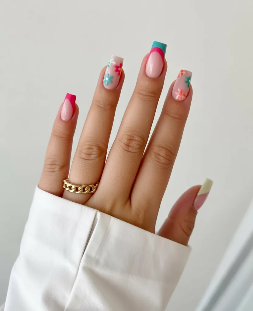 This design feels playful and creative, like spring art brought to life on your nails. The mix of bright French tips with floral accents gives a lively, youthful energy while still staying polished. It’s Fun, expressive, and perfect for someone who enjoys a little personality in their look.
