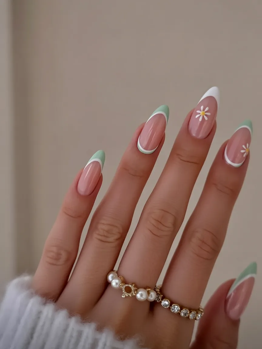 There’s a fresh, calming vibe to this look that feels very spring-forward. The soft Green French tips paired with tiny daisy details bring a natural, airy feel that’s both modern and comforting. It’s subtle, stylish, and quietly confident.