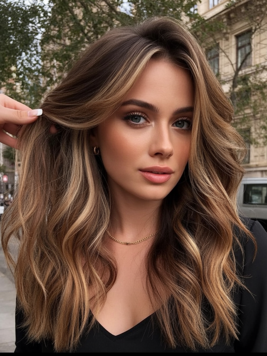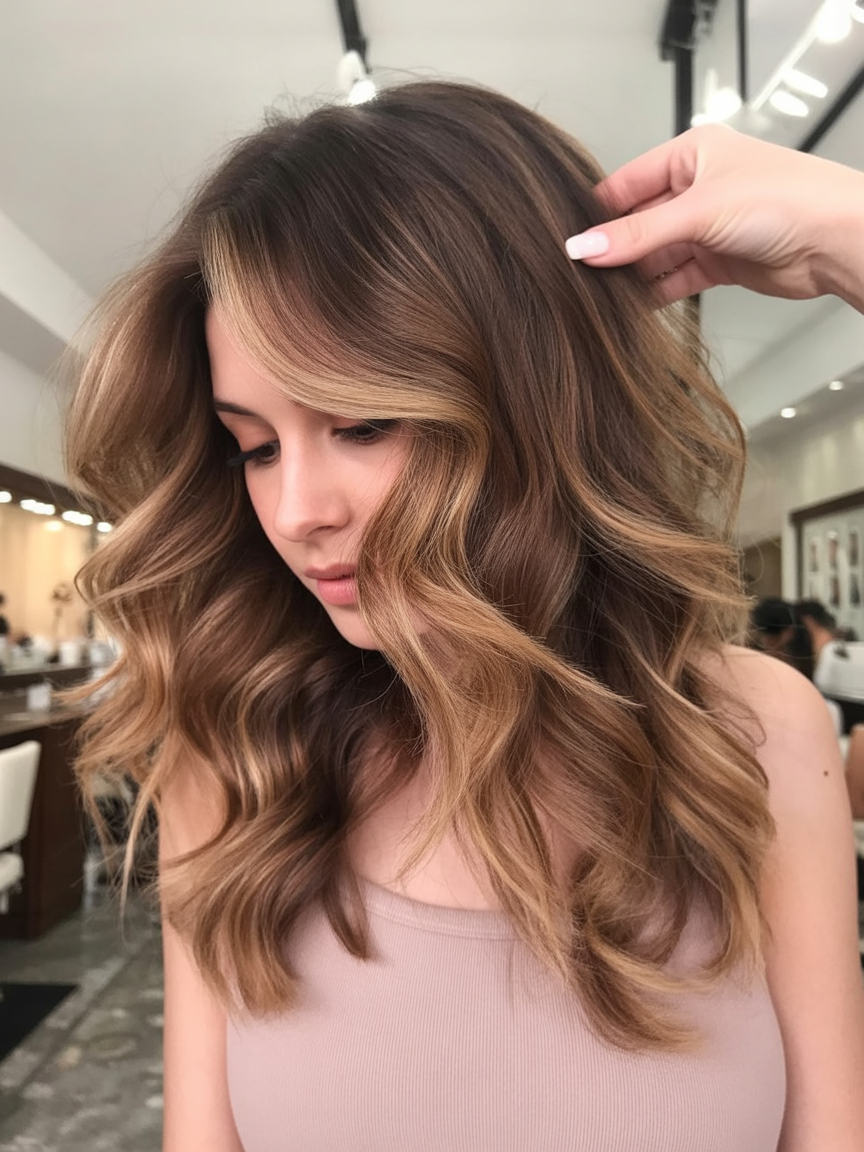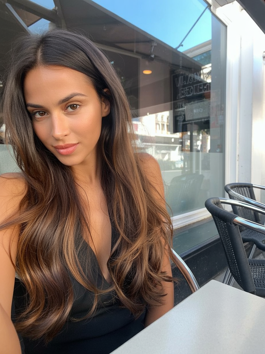 The gentle waves create movement without drama, while the blend of warm browns and subtle balayage caramel highlights gives the hair a natural glow that feels polished but never overdone. It’s the kind of style that looks equally good at brunch, at work, or on a spontaneous evening out.
