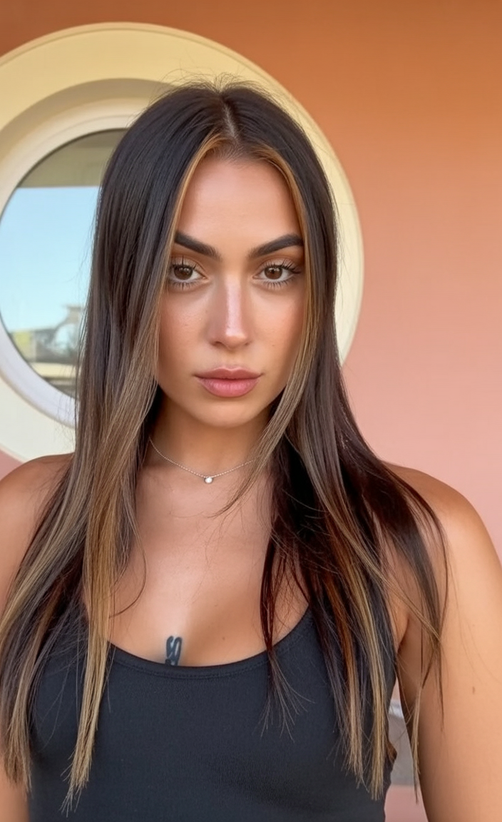 There’s a confident, almost editorial edge to this look. The long, straight silhouette feels clean and modern, while the lighter strands around the face soften the overall mood. It’s bold without being loud—perfect for women who like their style sharp but still feminine. The contrast brings brightness to the face without losing that deep, dark brunette base.
