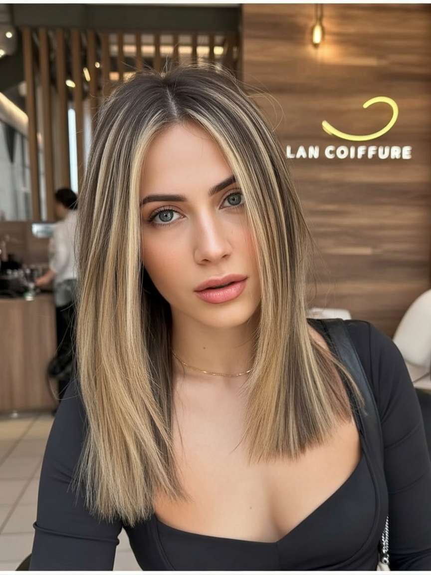 This haircut feels fresh, current, and quietly youthful. The clean lines of the medium length give it structure, while the softly blended highlights keep it approachable and light. There’s a cool elegance here—nothing forced, nothing trendy for the sake of it. It’s the kind of look that instantly makes your outfit feel more intentional.