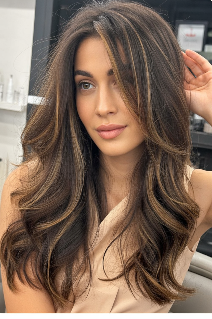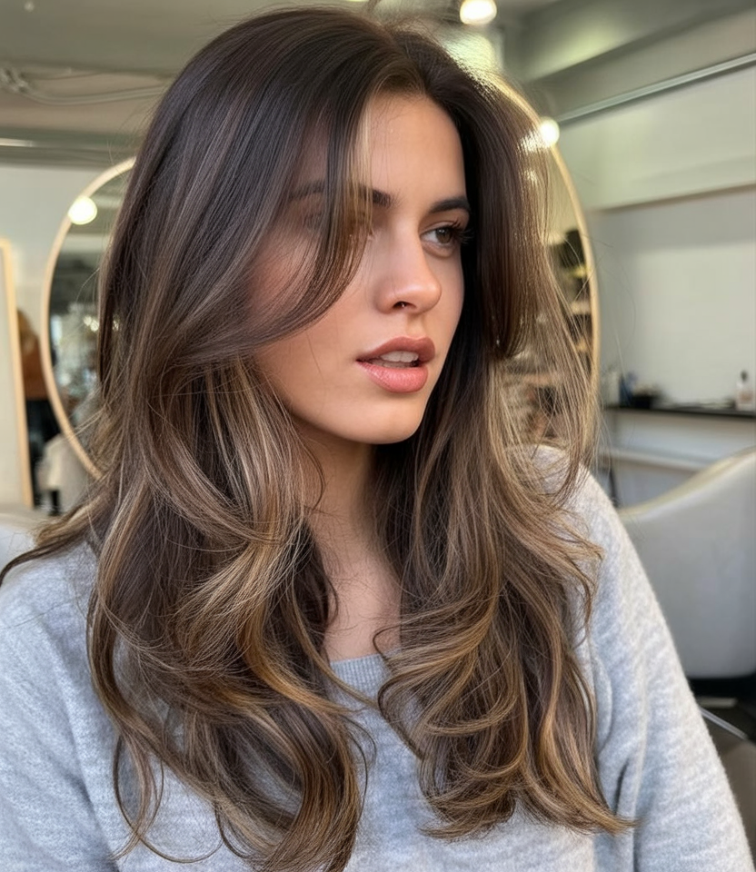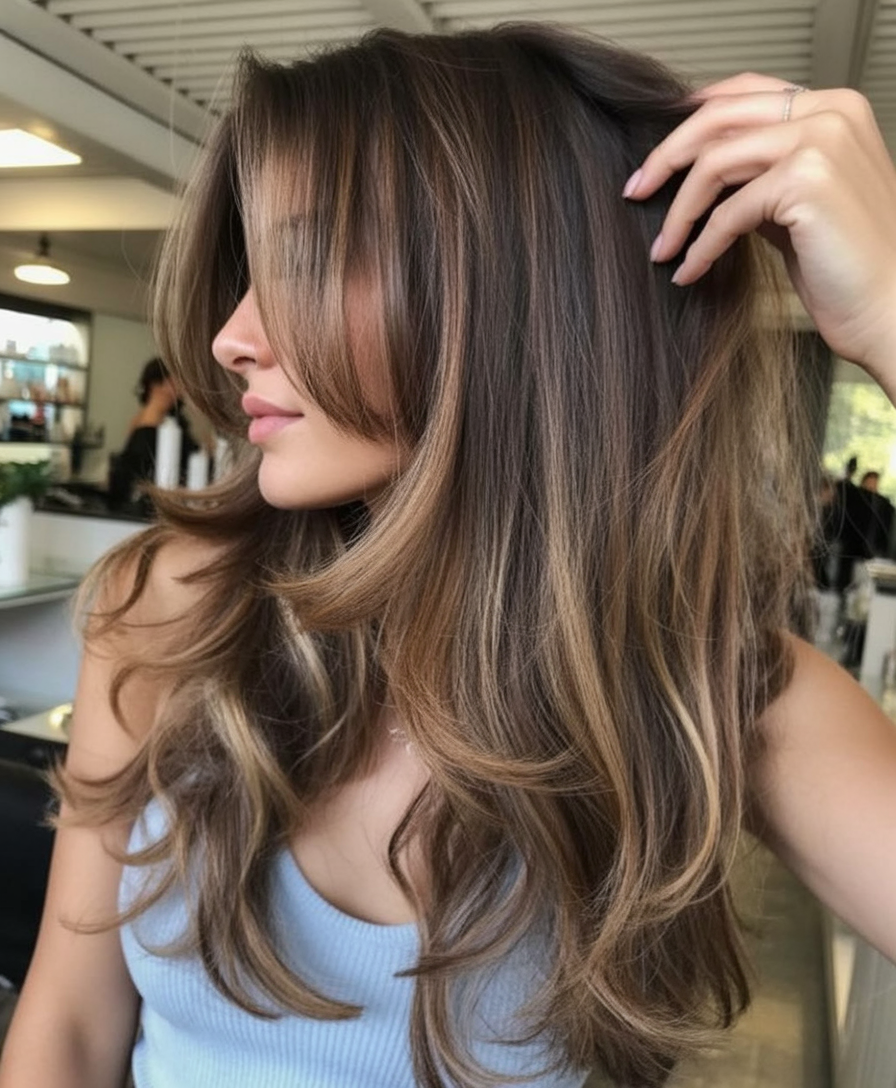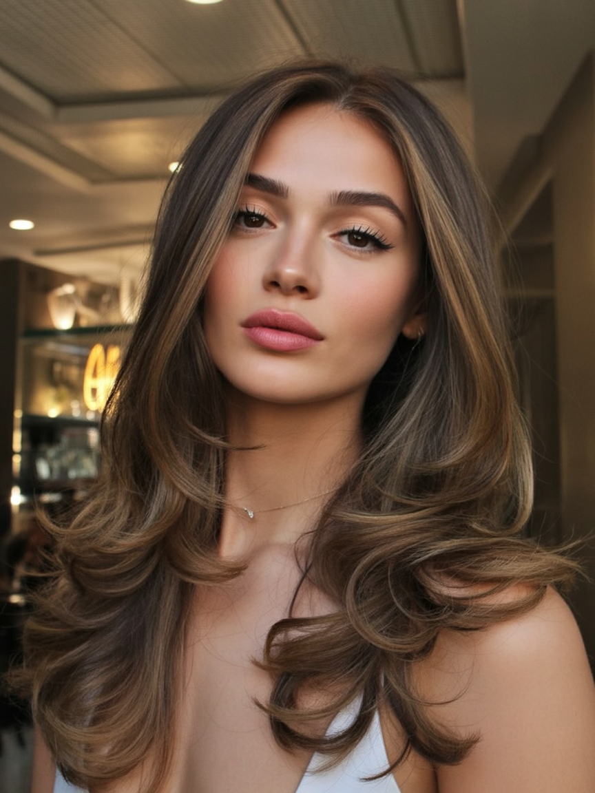 This cut is ideal for women who love length and want it to feel intentional, not heavy. It works beautifully on straight to slightly wavy hair and pairs well with warm browns enhanced by balayage. A smooth blowout brings out the shine, while loose waves keep it relaxed and wearable for everyday life.