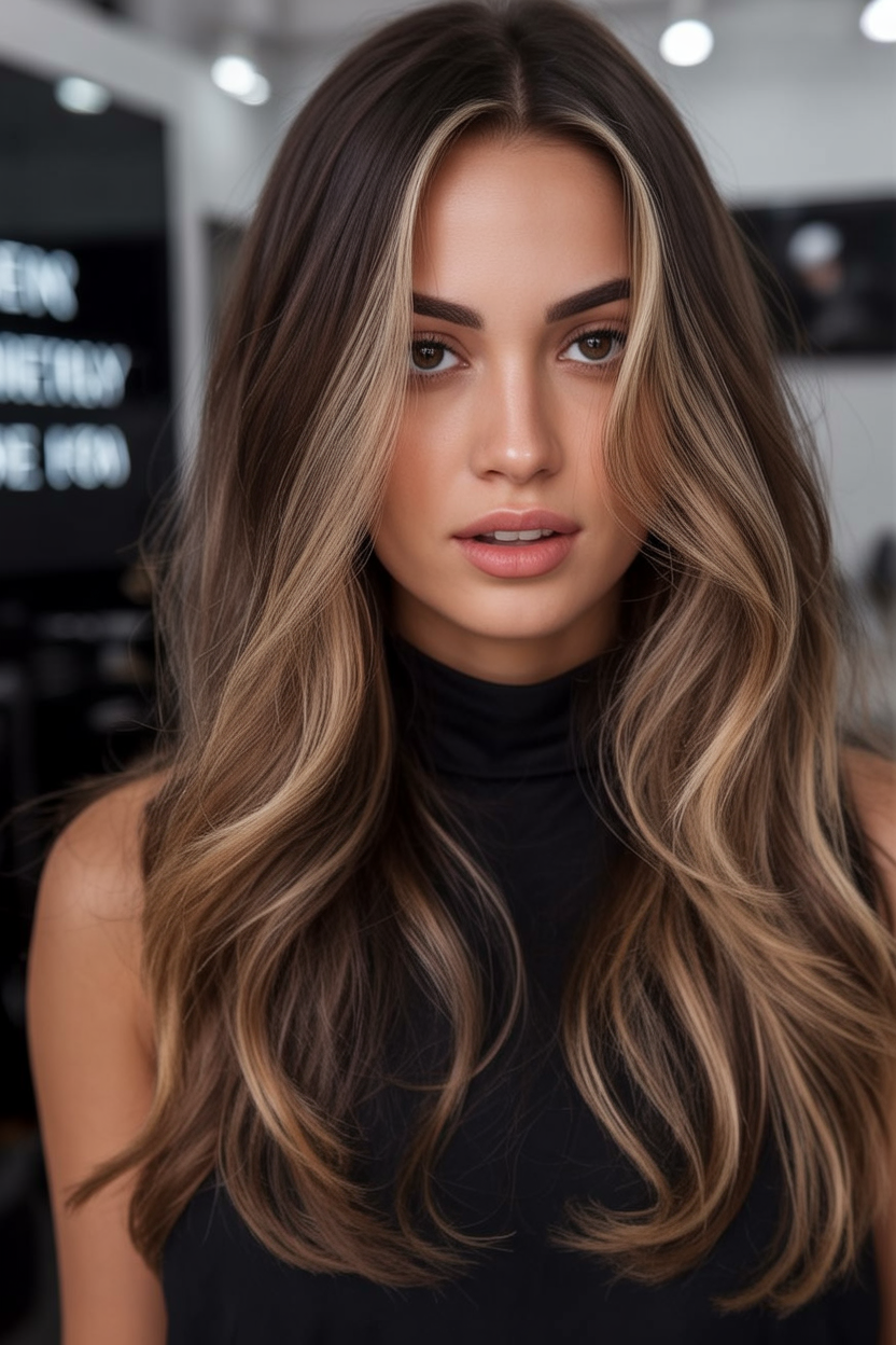 13. Long Brunette Layers with Soft Blonde Contour