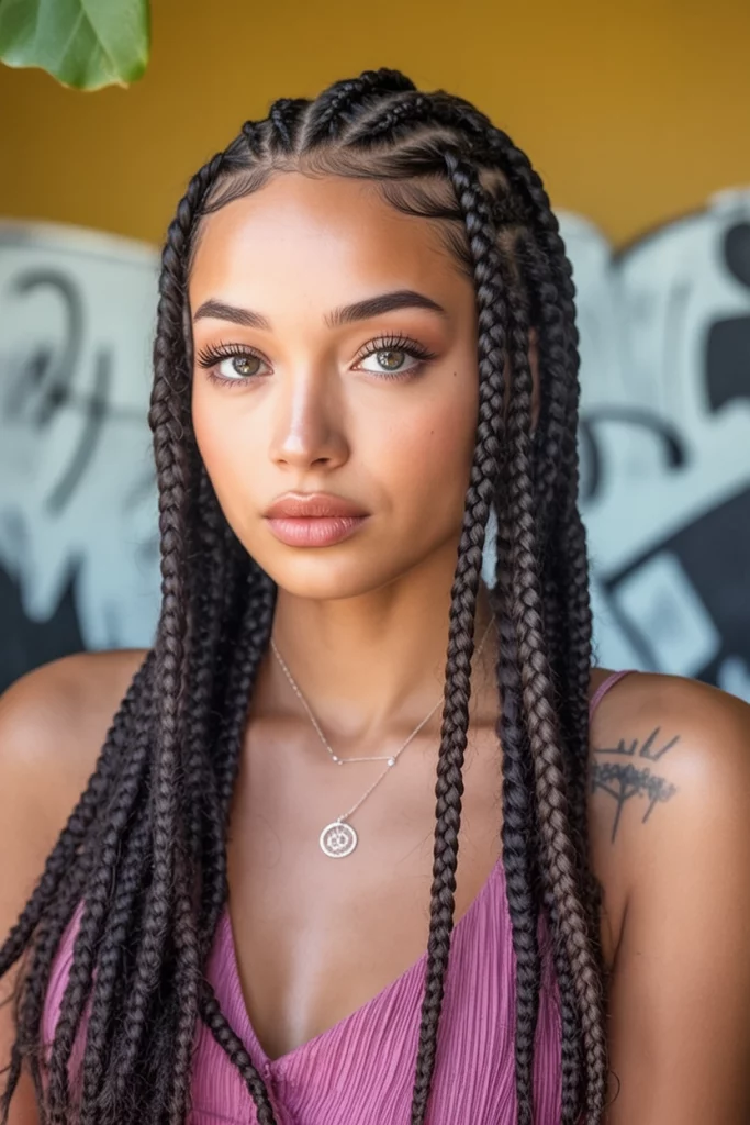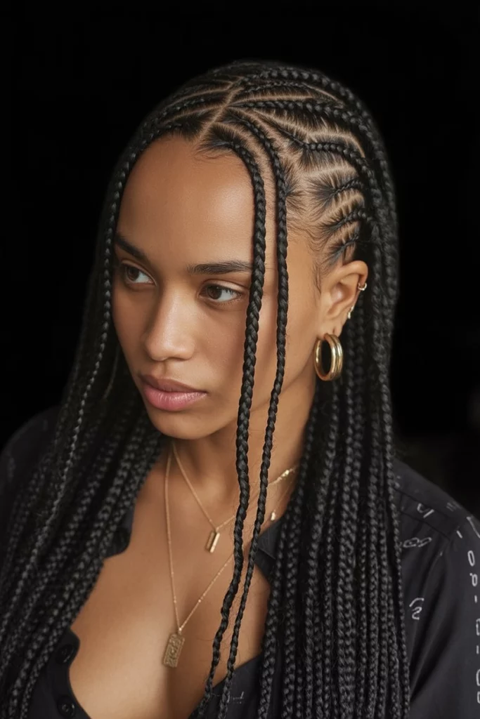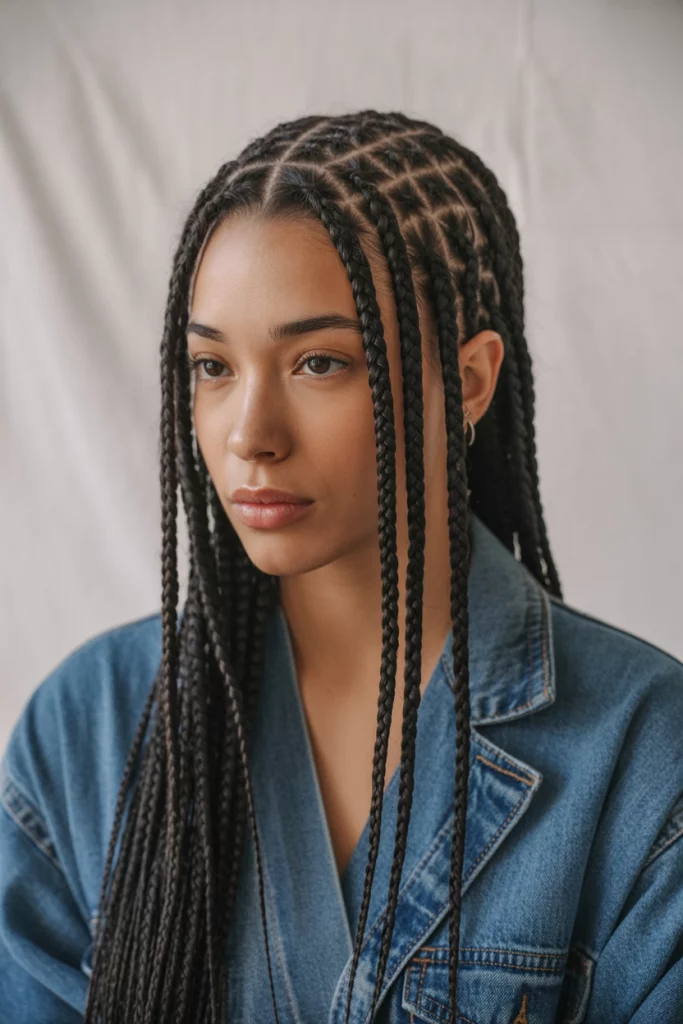 This one is all about the details — the sharp, clean freestyle parting gives these braids a graphic, architectural vibe. It feels artistic and intentional, like a work of hair sculpture. The vibe is strong but minimal, and paired with denim? So effortlessly cool.