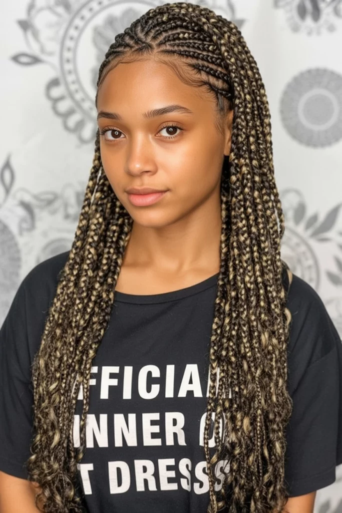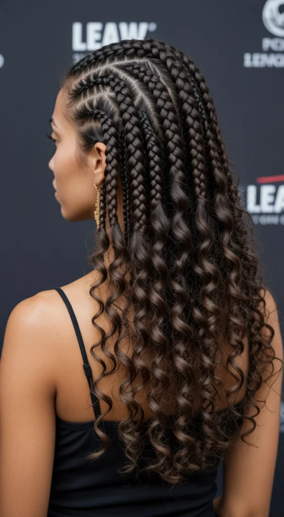 This braid and curl combo brings the best of both worlds. From tight, defined cornrows at the top to juicy with curls spiraling down, the look screams red carpet ready. It’s a textured, flirty finish that adds bounce and drama.
