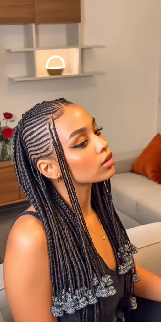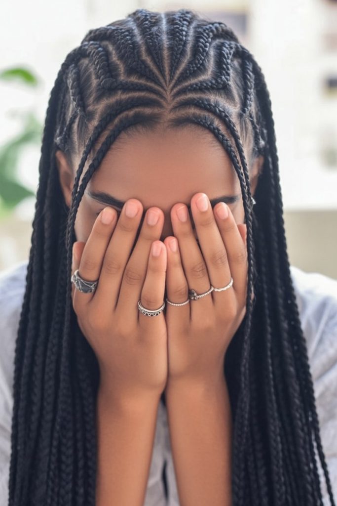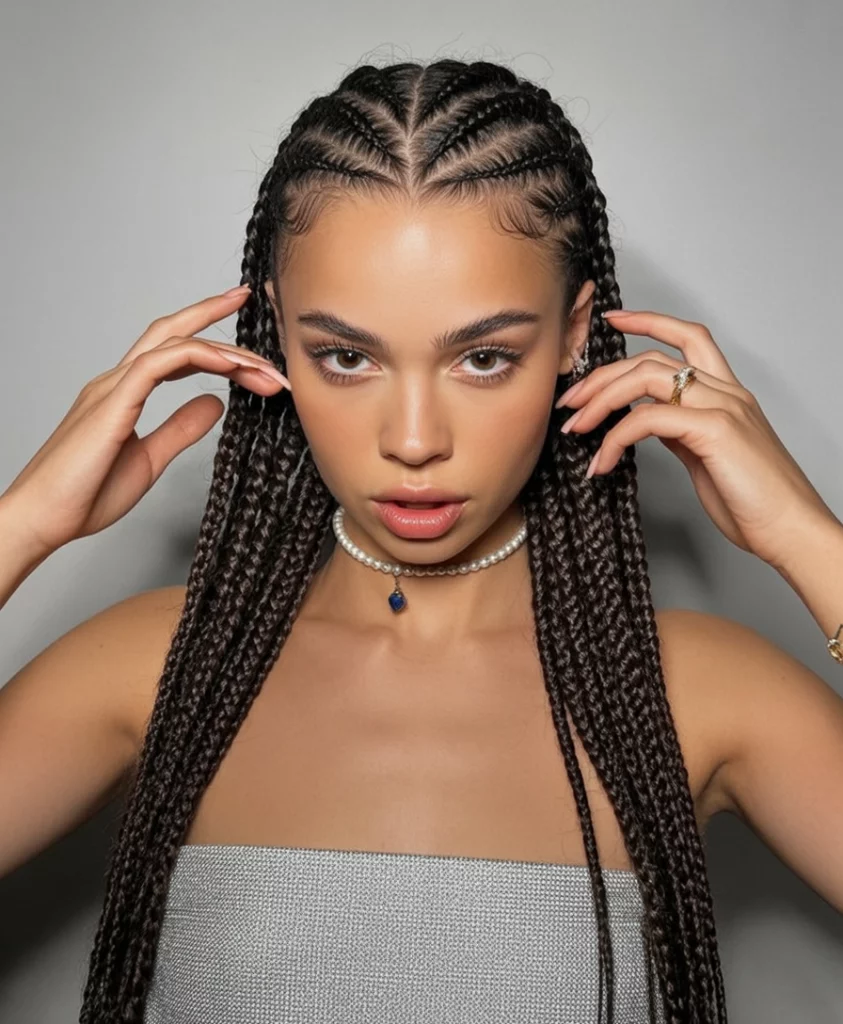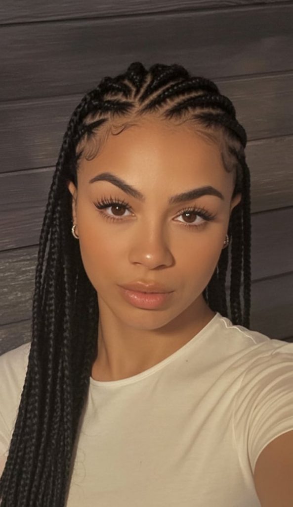 These Fulani braids are all about symmetry and attitude. The center part flows into symmetrical cornrows that seem to hug the scalp like a crown. There’s power in precision here — it’s the kind of style that turns heads without saying a word. Pair it with chunky rings and minimalist nails, and you’ve got a vibe.