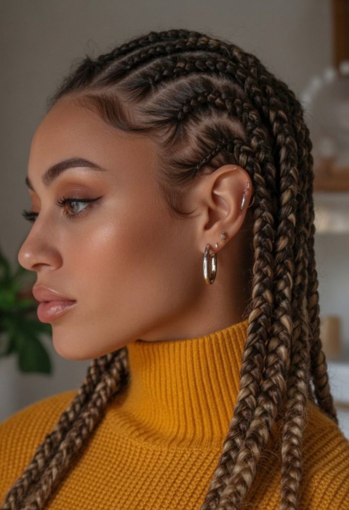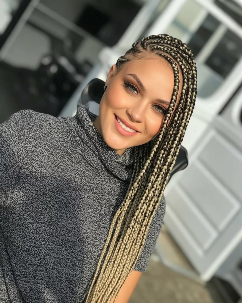 If you’re ready to experiment with color but still want a classic shape, these blonde and black Fulani braids deliver. The cool-toned highlights create beautiful dimension that flatters the face, especially paired with golden earrings and a bold sweater.