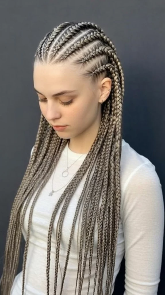 Cool, silvery braids with intricate cornrow patterns make this look feel futuristic and fresh. The color alone is a statement — icy, bold, and a little rebellious. It’s a fun reminder that beauty doesn’t come with an expiration date.