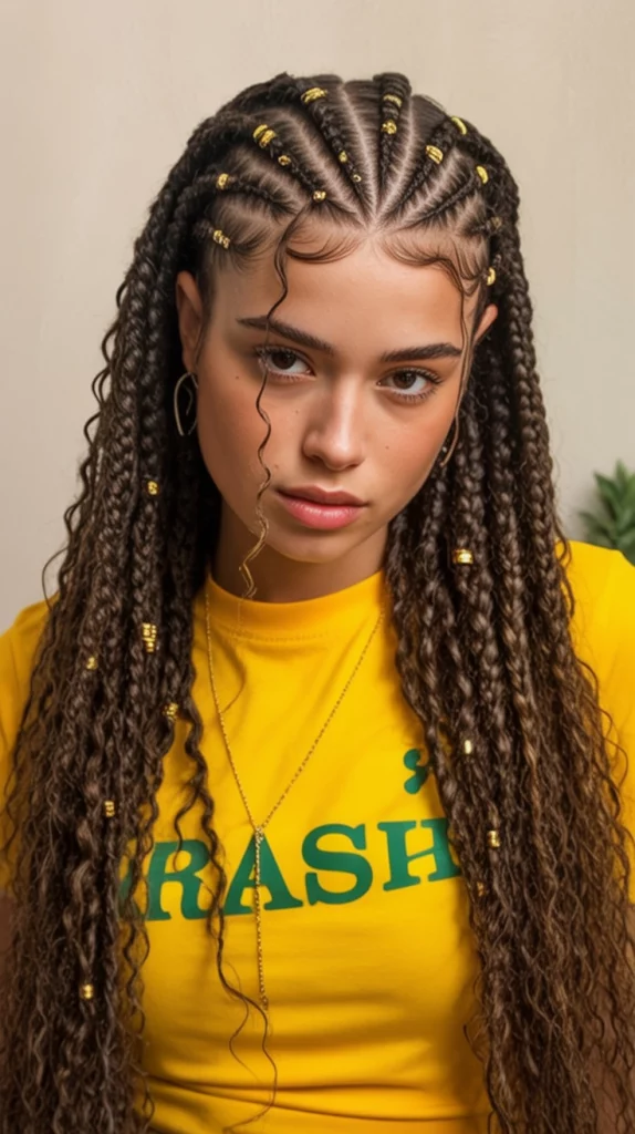 This braided look is pure playfulness with a modern boho twist. The tight, neat cornrows at the crown flow into free-flowing cachos at the bottom — and those gold cuffs? Instant glam. It’s confident, rebellious, and softly romantic, all at once.