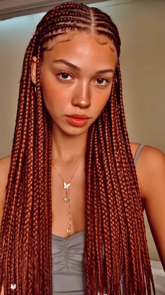 With rich reddish-brown tones, these braids give a warm, autumnal glow all year long. It’s soft yet bold — and that middle part keeps it looking intentional. Paired with butterfly jewelry, it’s a total mood.