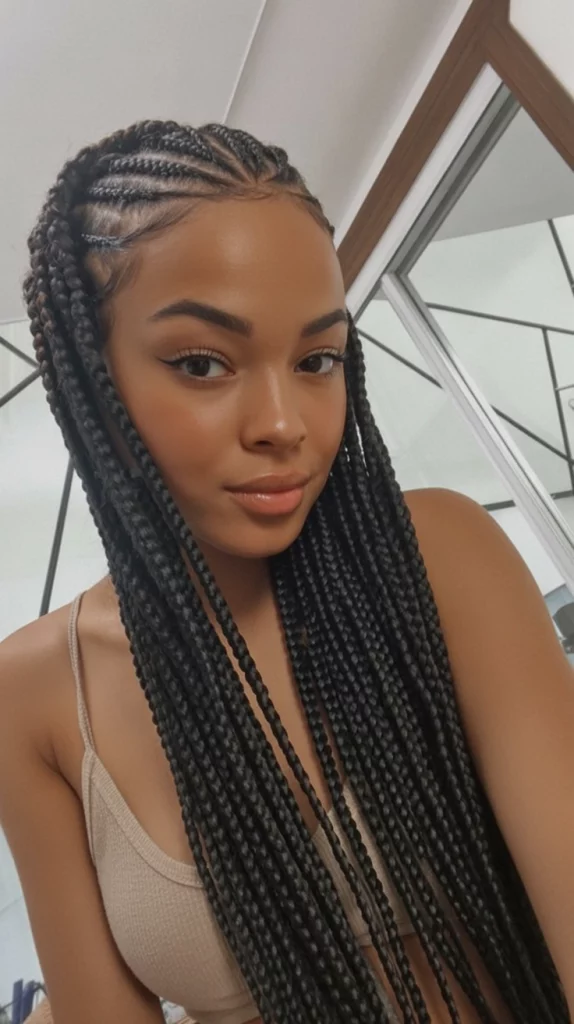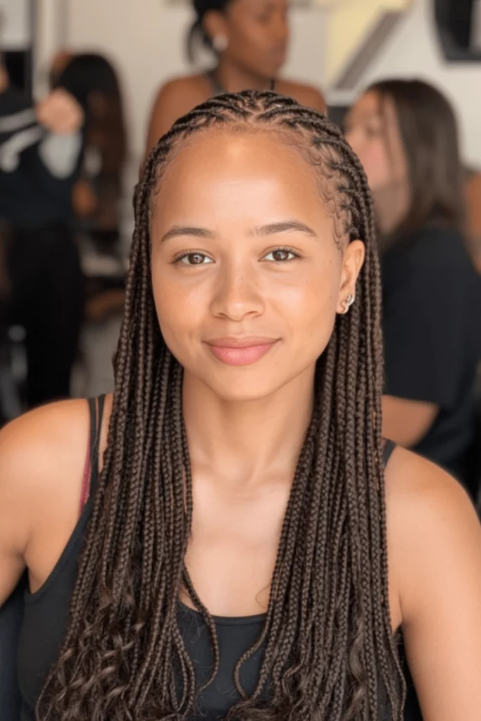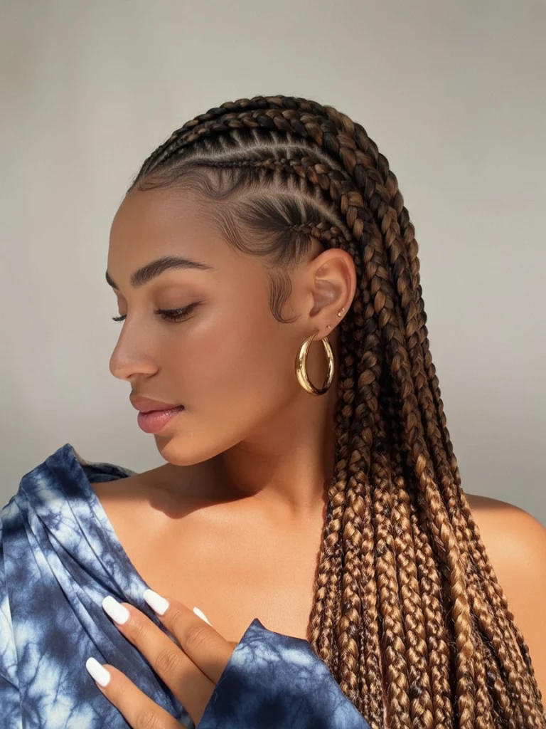 This look flatters medium to thick textures and suits oval or heart-shaped faces beautifully. Keep your edges sleek with a little styling gel, and protect the braids overnight with a silk wrap. Bonus? It’s incredibly low-maintenance — perfect for a woman who loves looking put together without all the fuss.