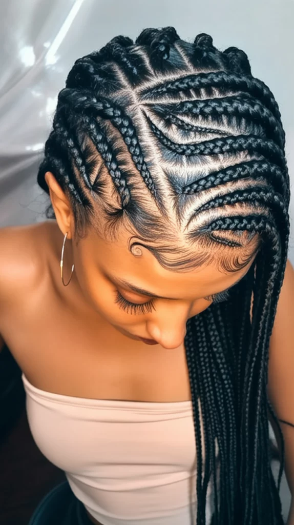 If you’ve got a busy schedule and want something that holds up through work and weekend errands, this one’s a dream. It’s one of the most versatile Fulani designs without curls — polished for the office, yet edgy enough for dinner out.