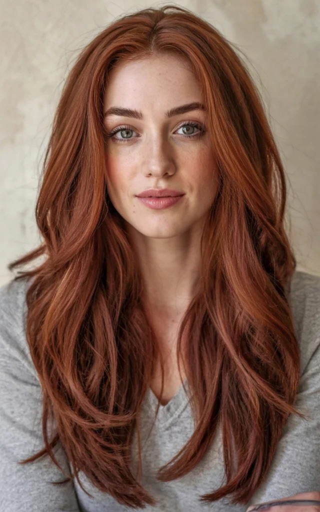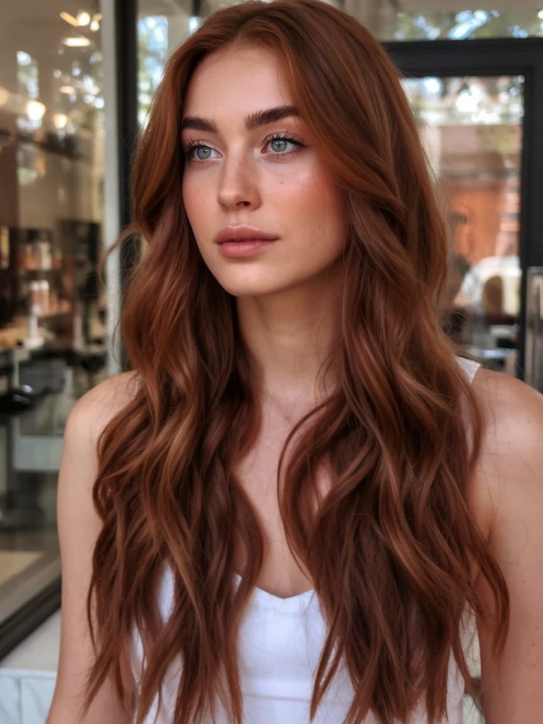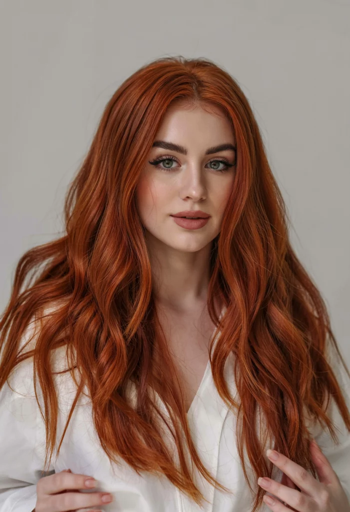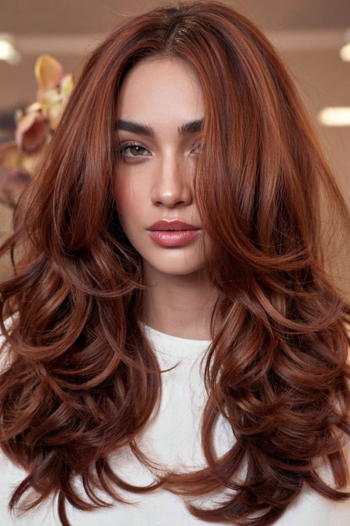 These rich cinnamon waves feel so perfectly in tune with autumn. The warm, earthy tone pairs beautifully with fall fashion — think creamy knits, suede boots, and pumpkin-spiced everything. The soft cascading waves give off that breezy, romantic energy, making this a true fall hairstyles 2025 favorite.