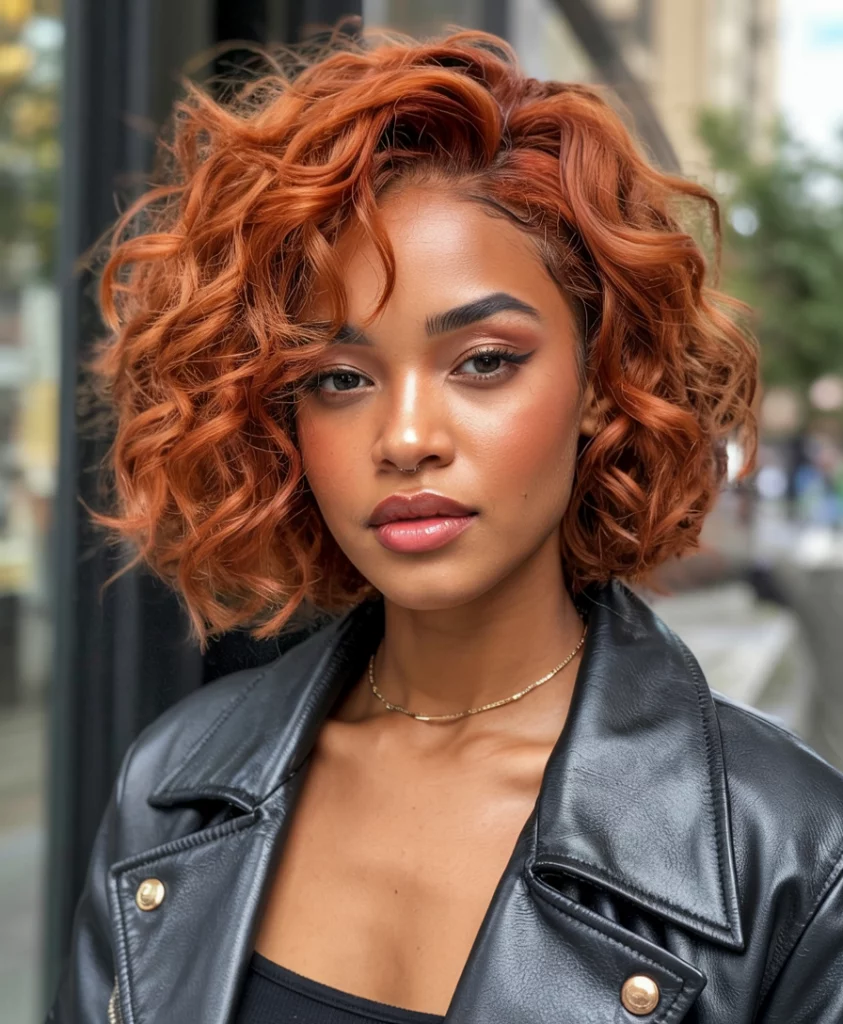 This short length curly bob in the most gorgeous pumpkin spice shade just screams fall hairstyles 2025. It’s bold, playful, and packed with texture — the kind of cut that gives you a little confidence boost every time you catch your reflection.