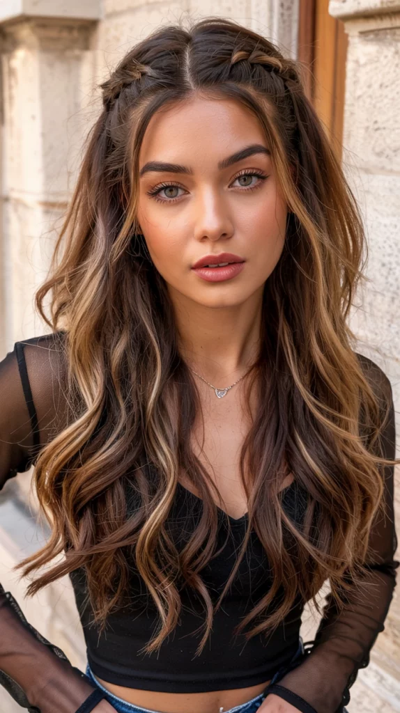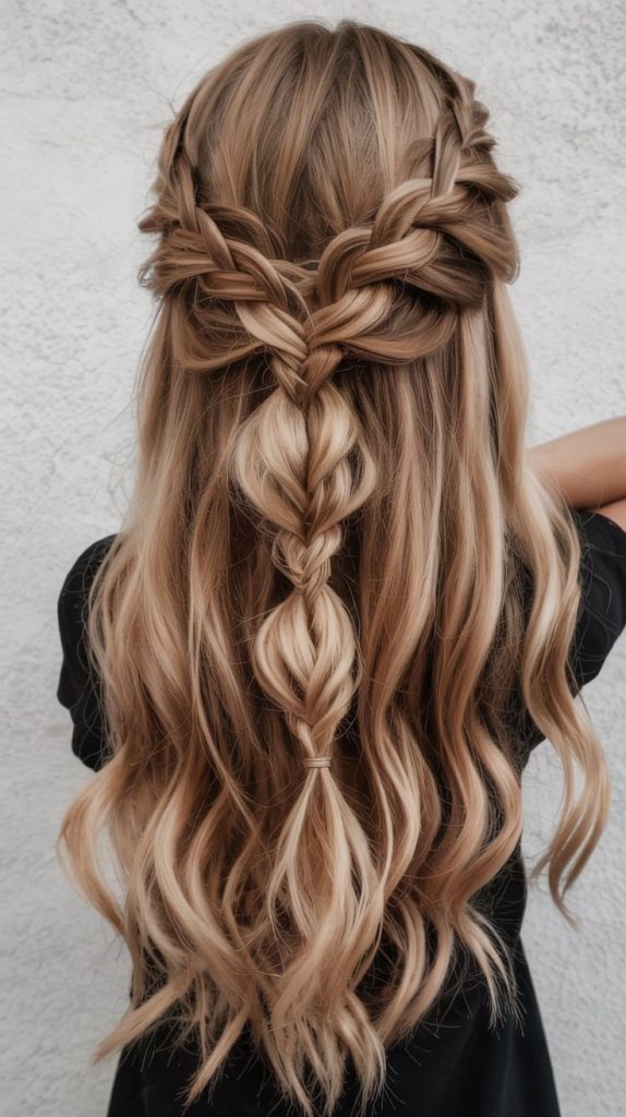 This style works wonderfully for long hair or extensions, especially if your hair has natural waves or a bit of curl. The braids help add texture while also disguising any greasy hair or second-day strands. A flexible hold spray will keep everything in place while still looking soft and touchable.