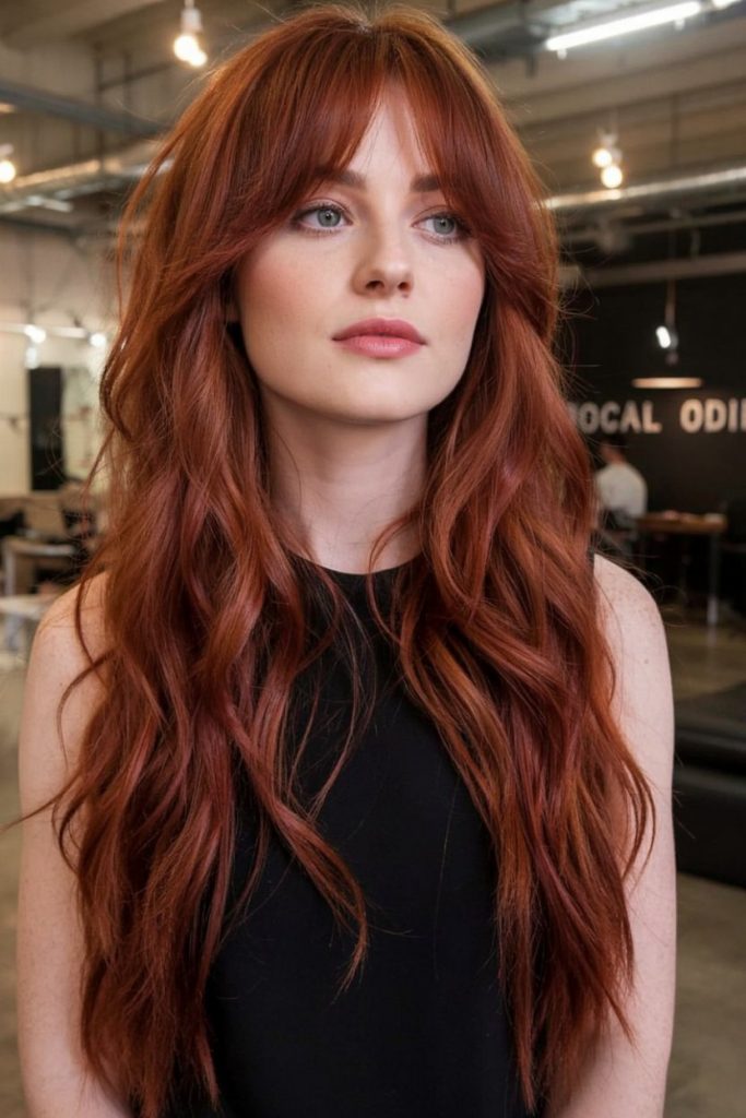 There’s something fiery and fabulous about long hair 2025 in rich red hues, especially when paired with curtain bangs. This cut has an irresistible baddie edge while still feeling totally wearable for everyday life. The waves add bounce and dimension — perfect for crisp fall days when you want your hair to feel as alive as the season itself.