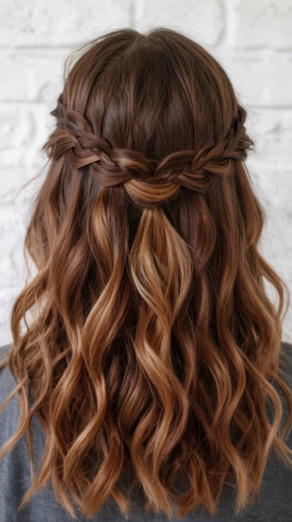 Perfect for medium length brunette or longer hair, this style shines when paired with face-framing highlights. It’s also a fantastic choice for greasy hair days — the braid hides roots while adding charm. Just a few pins and a bit of texture spray will keep everything in place.