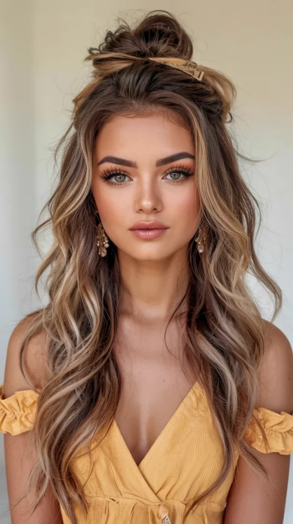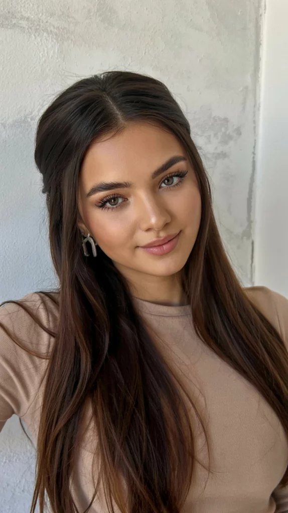 There’s something timeless about a sleek, half-up style on brunettes long. It’s polished but not too fussy — a perfect go-to look for both office days and casual weekends. The smooth finish feels so modern and chic.