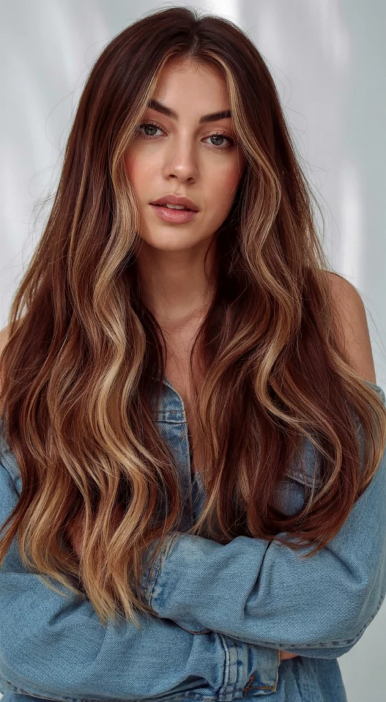 Blended brunette with blonde highlights gives you that perfect sun-kissed look to carry into fall. The contrast keeps things interesting, while the long, loose waves feel casual and chic — great for everything from school runs to weekend brunches.