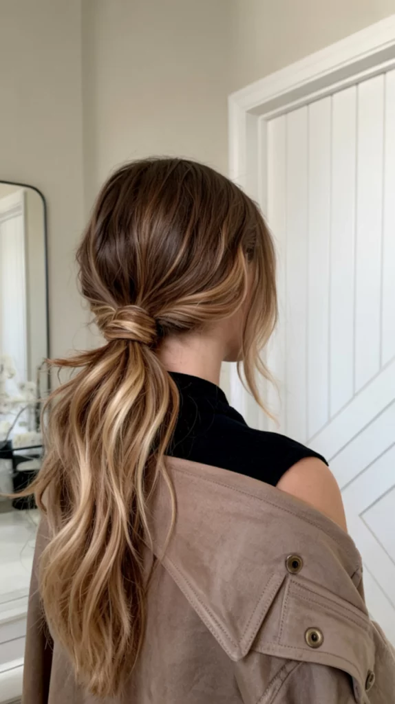 Some days, you just need that quick and easy style that pulls everything together without much fuss — enter the low textured ponytail. The wrap detail gives it a chic, elevated touch that works beautifully with a suede jacket or cozy sweater. It’s effortless, modern, and ideal for busy fall mornings.