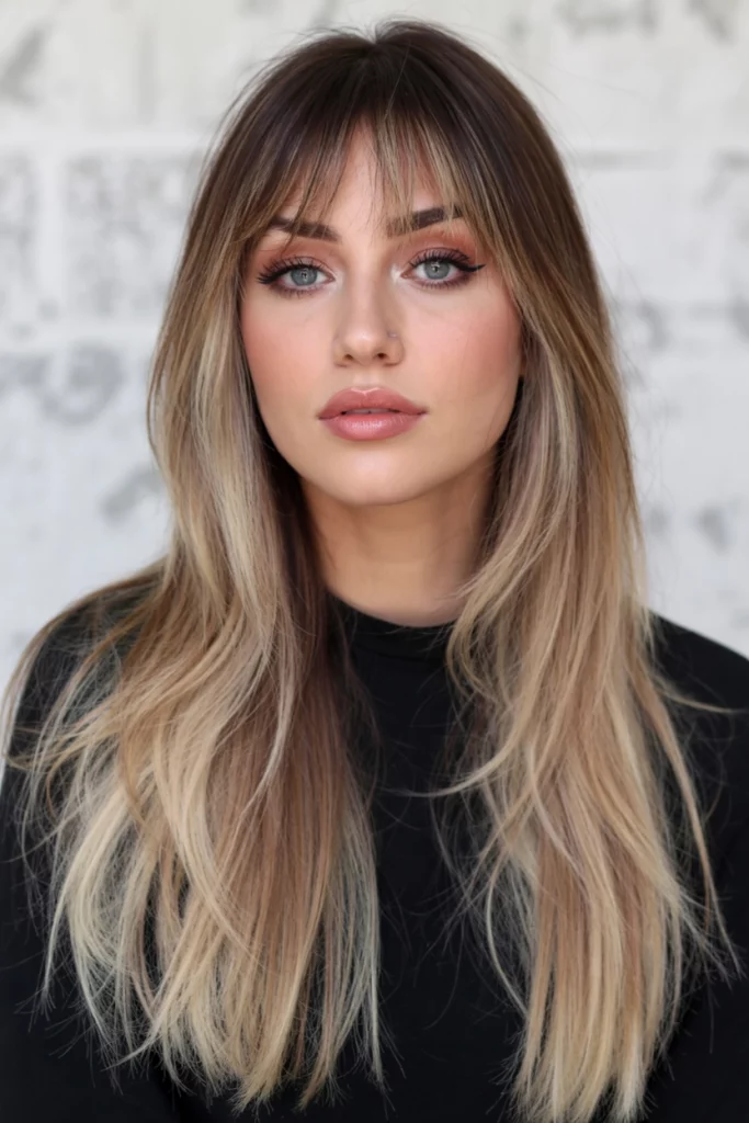 Soft, feathered curtain bangs combined with long blonde layers create an effortlessly cool fall hairstyles 2025 look. It’s breezy, youthful, and full of movement — perfect for adding a bit of brightness to crisp fall days.