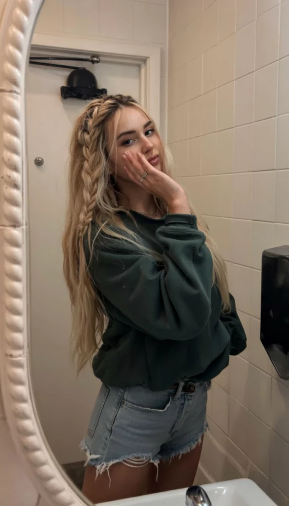 This braided half up half style feels like a sweet nod to fall festivities. The soft, loose curls bring volume and movement, while the braid woven across the crown adds a touch of handcrafted charm. It’s exactly the kind of look you’d wear to a pumpkin patch date or casual weekend outing.