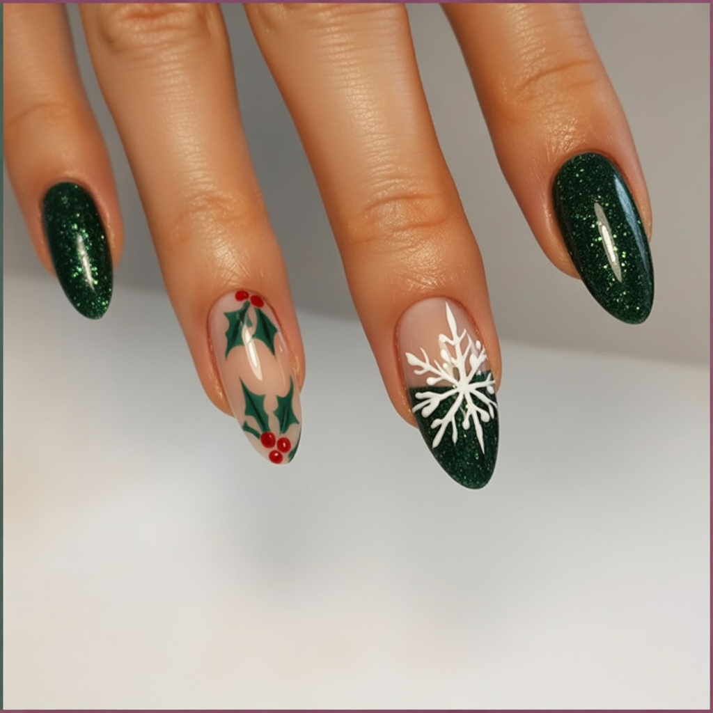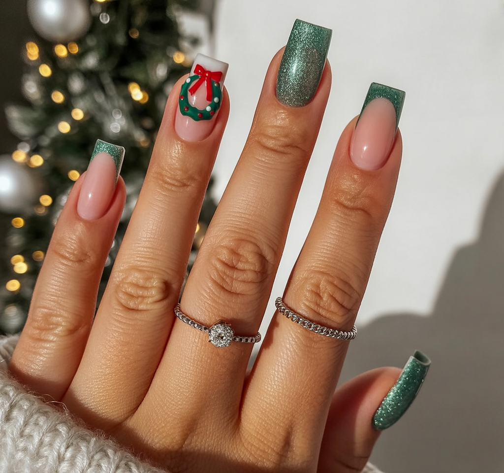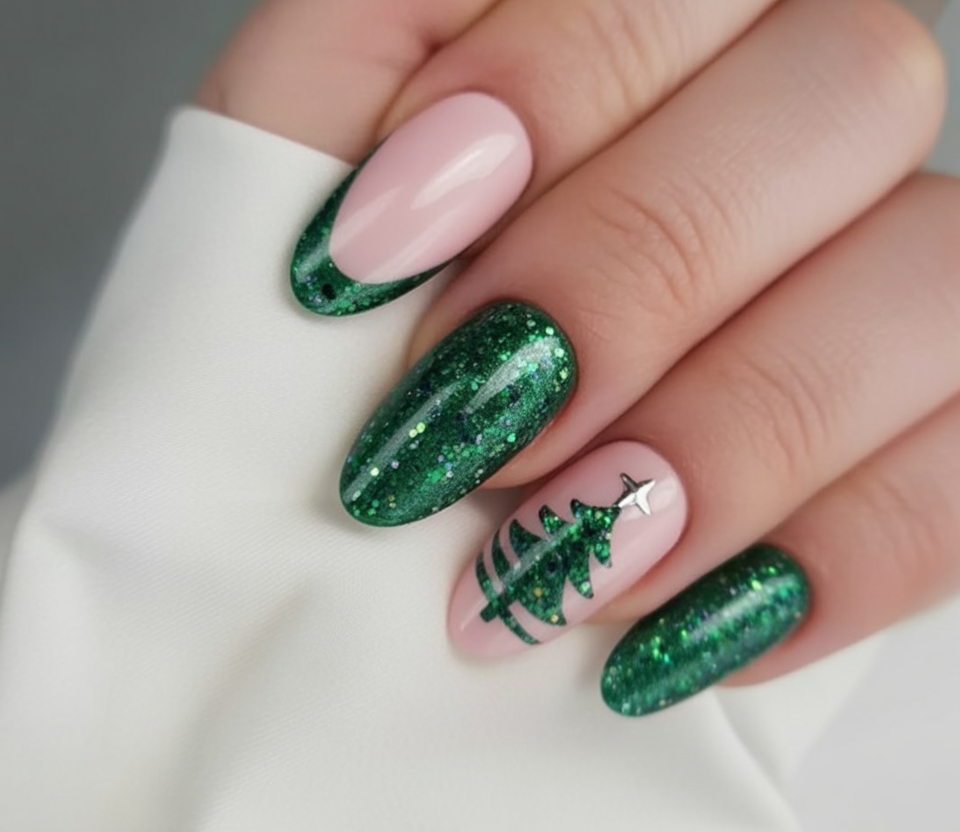 Glitter lovers will surely call this one their holiday favorite. That rich green sparkle looks bold and glamorous, while the delicate Christmas tree art on a blush pink base gives the perfect festive, yet feminine, finish. The combo of shimmer and soft tones feels classy: a manicure you would wear to a holiday gala or Christmas Eve dinner.