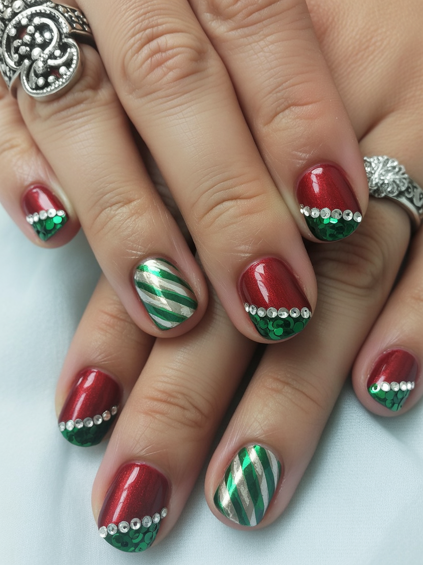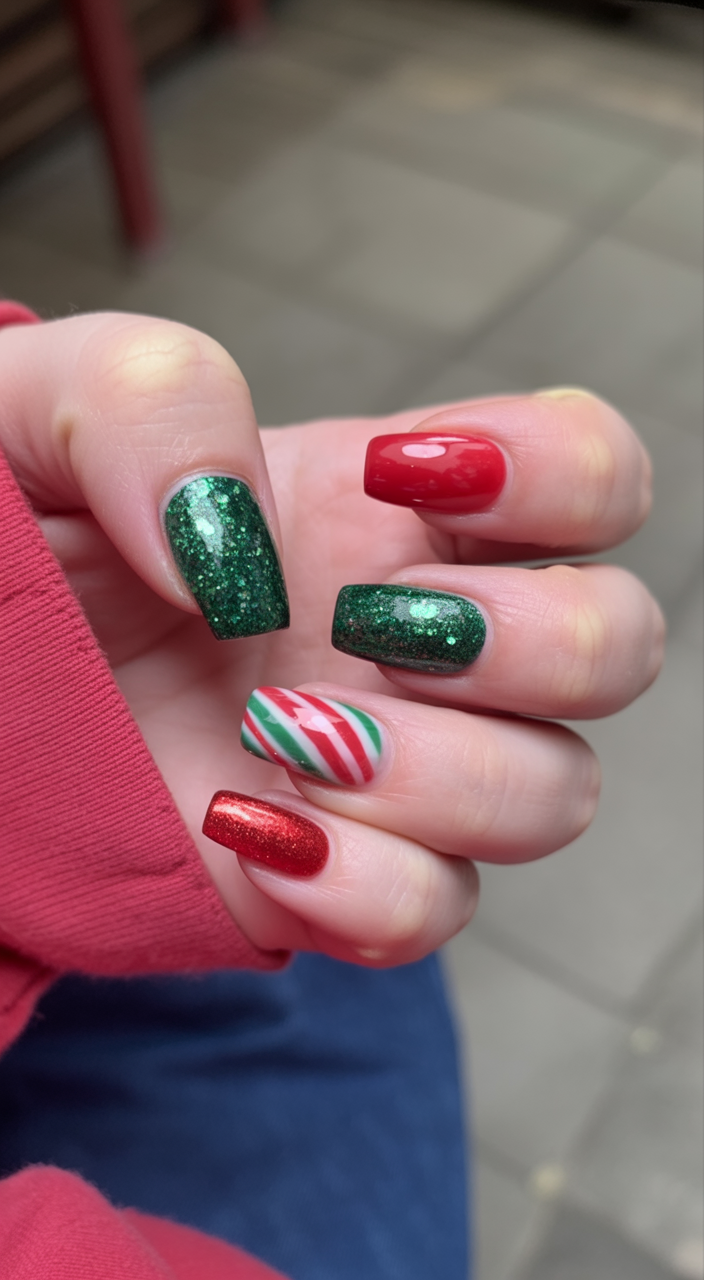 Like unwrapping a box full of sparkly Christmas decorations and loving every glittery bit of them, this manicure shouts celebration. Being loud red, glitter green, and stripy, host extra crazy fun and a little bit more Christmas. It just is not going for perfect—just like the holidays, so much color and energy. If you’ve ever wished your nails could sparkle to light up a Christmas tree, this is the one.