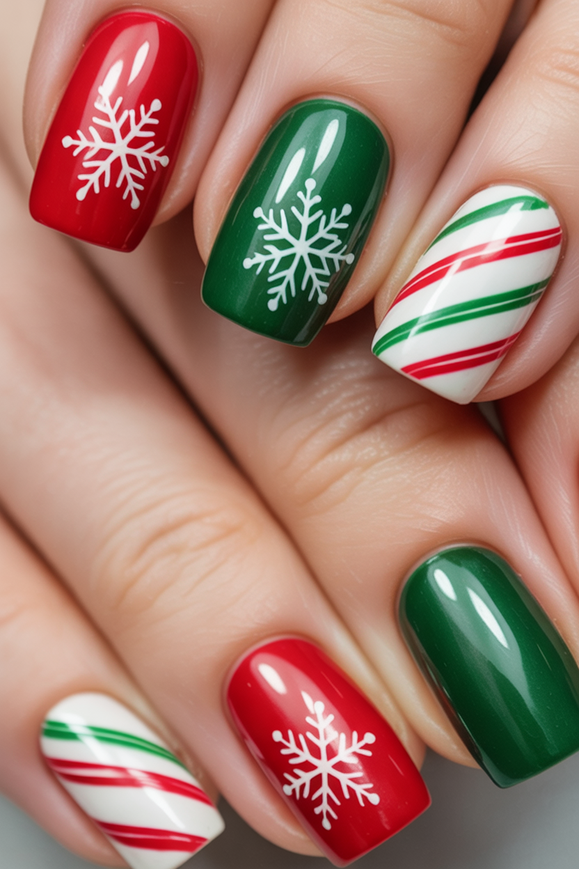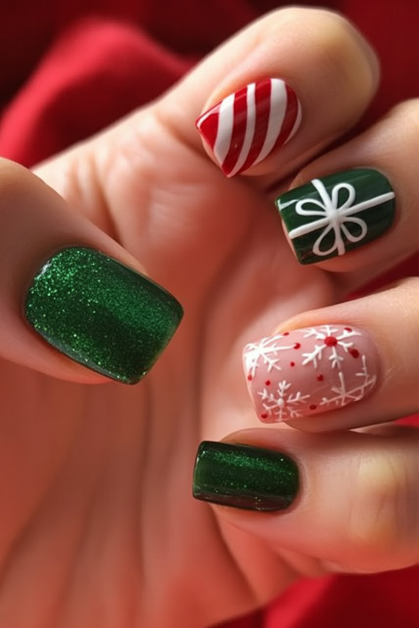 These nails feel like stepping right into a Christmas movie — stripes, shimmer, and pops of bold red and green. The candy cane accents are fun and instantly nostalgic, while the glittery green and snowy white nails keep things stylish. It’s the kind of manicure that puts a smile on your face every time you glance down.
