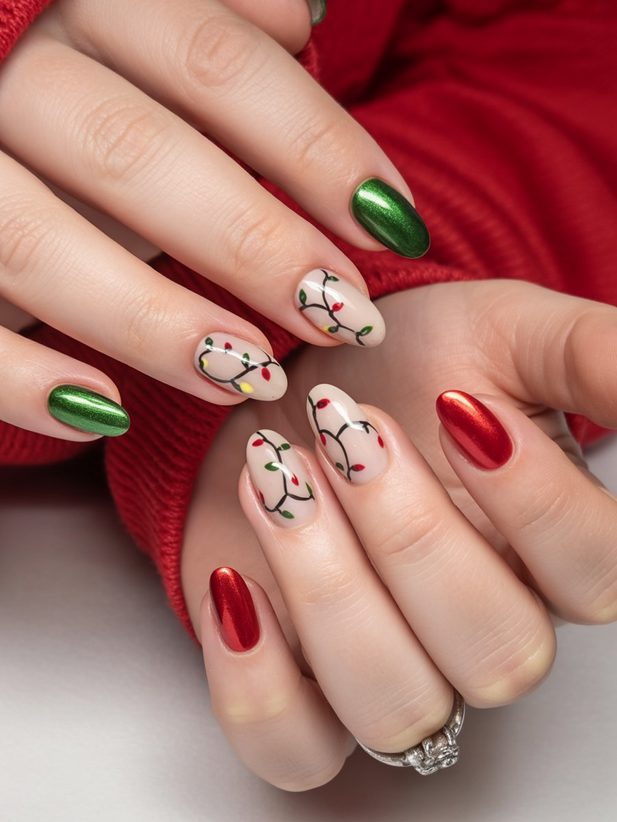 Imagine the magic of twinkling Christmas lights captured on your nails-that’s exactly what this design would do. Bright string lights are waltzing across a soft base, framed by alternating red and green metallics. The atmosphere has a tinge of whimsy and nostalgia, like wrapping yourself in a cozy blanket to watch your favorite holiday movie with cocoa in hand.