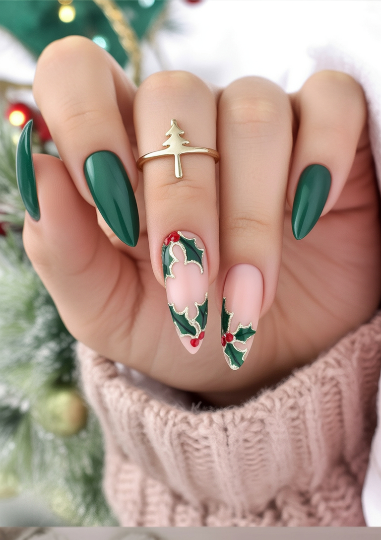 This look suits women who adore almond-shaped nails but still want a playful nod to Christmas. The contrast between nude polish and detailed holly leaves and simple snowflakes is perfect for running errands by day and heading out to get-togethers by night. Match this look with gold accessories or a velvet dress, and upscale that Christmas vibe.