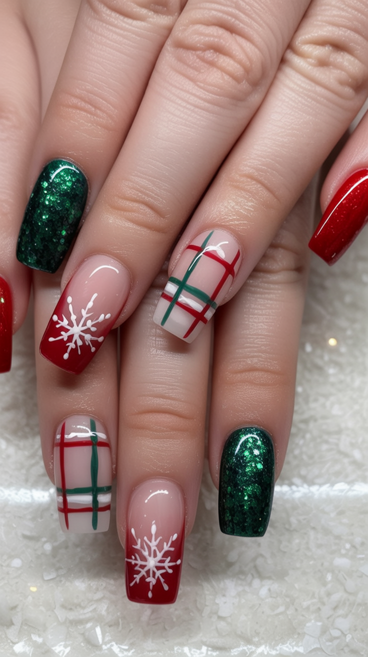 This manicure captures the joy of Christmas mornings-lush sparkling green, candy red tips, plaid, and delicate snowflakes, just like wrapping paper and holiday pajamas. It is a look that makes the heart want to sing along with the carol while baking cookies.