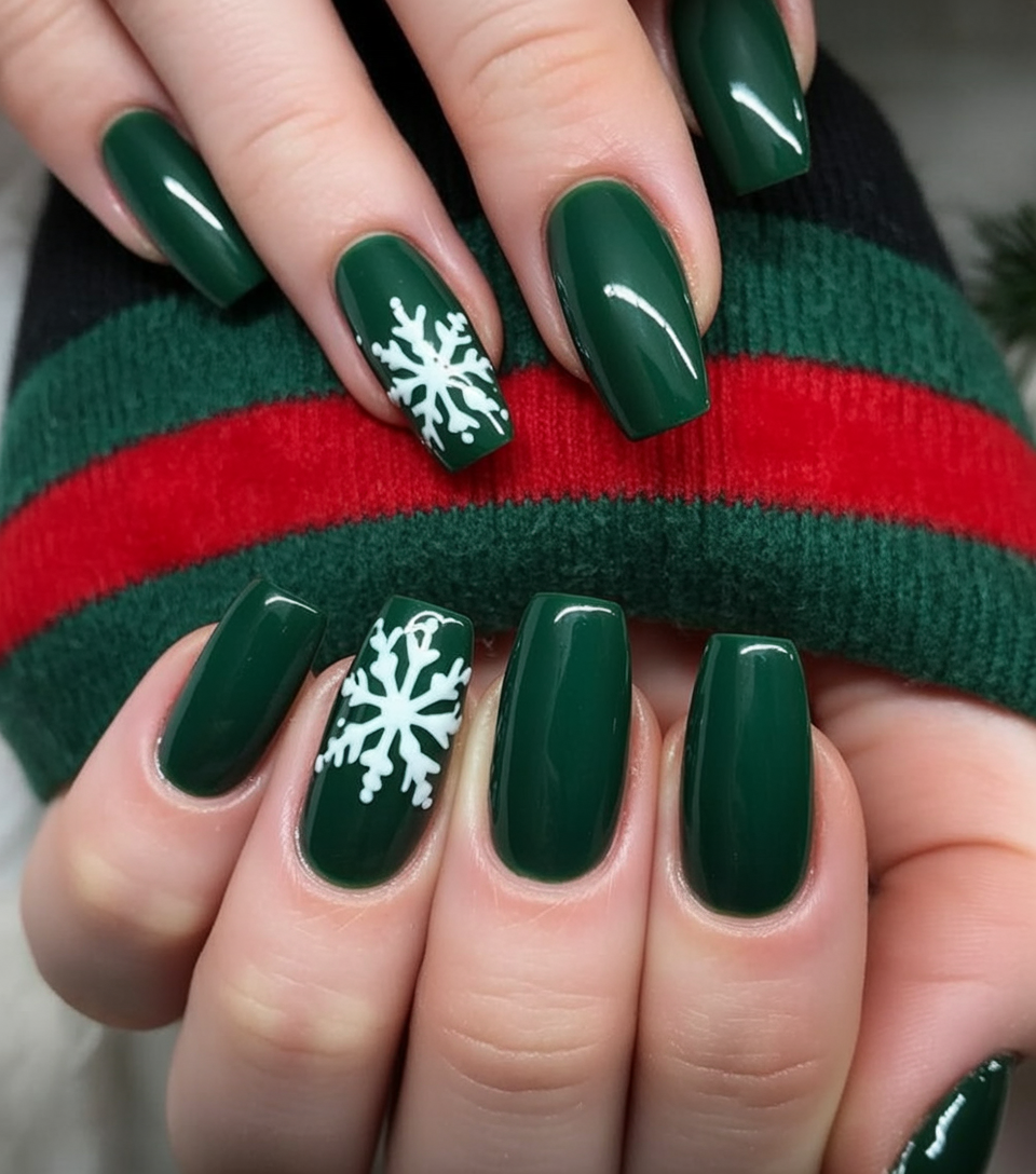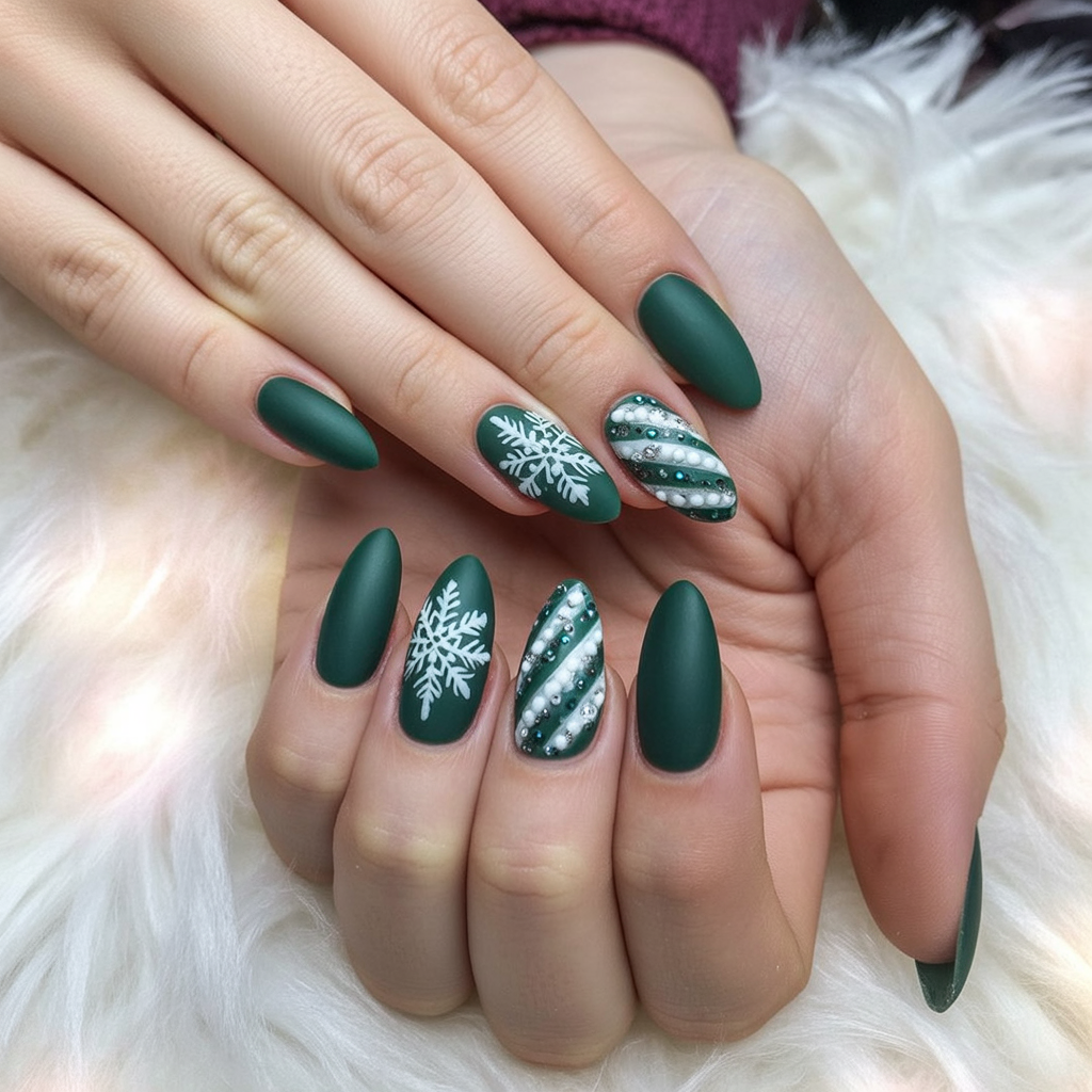 Something magical about this would be a deep green almond nail paired with snowy detailing. Matte feels velvety and uber chic, and snowflakes set the mood instantly. Throw in candy-cane-inspired stripes adorned with tiny pearls-suddenly this feels like a cozy Christmas evening-playful and elegant enough to show off at holiday parties without going over the top. This is the kind of manicure that makes you smile every time you glance down at your hands.