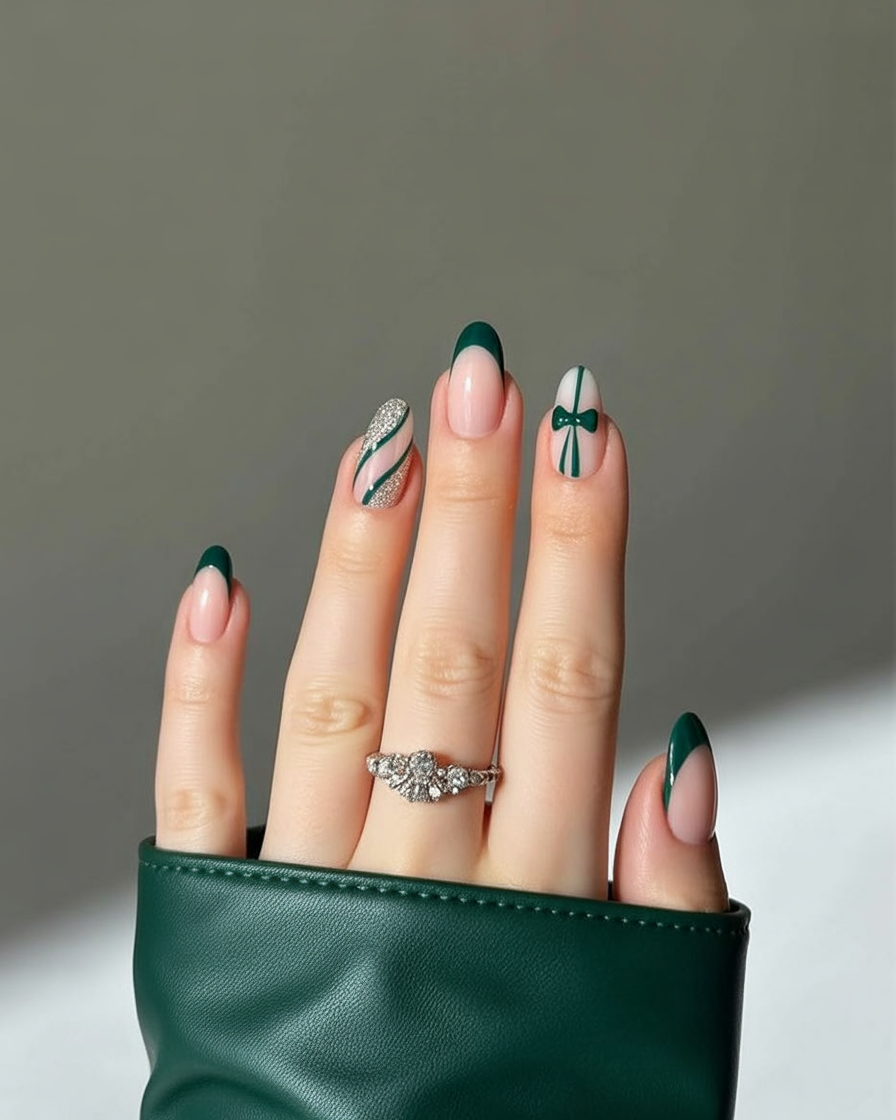 This manicure looks like your fingertips have been wrapped up like tiny holiday gifts. With deep green French tips, silver sparkle, and an adorable bow accent, it’s the perfect balance of cute and elegant. It’s festive without being over the top, making it feel modern yet whimsical.