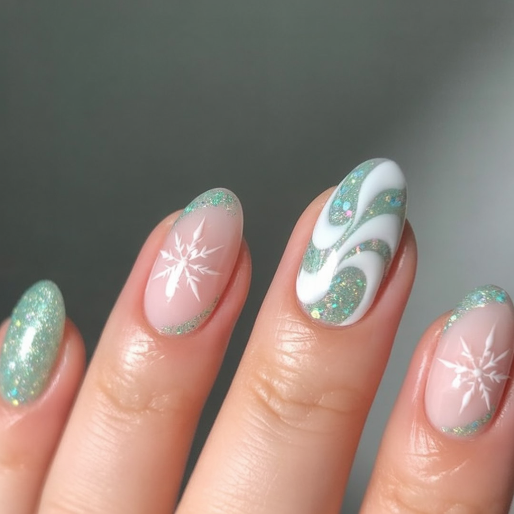 Soft glittering mint with delicate white snowflakes — this design feels like the first morning snow, sparkling under the sun. The swirled patterns add a touch of whimsy, making it feel dreamy and magical. It’s feminine, subtle, and perfect for anyone who loves a winter wonderland vibe without going too bold.