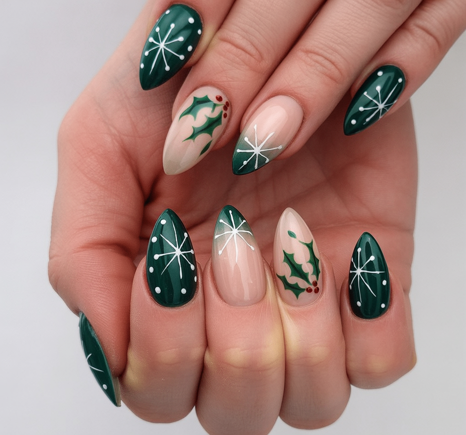 Green, nude, and hard pops of red combine in an upbeat design featuring holly leaves and starburst snowflakes. Festive without being too much; it strikes the perfect balance between Christmas fun and stylish sophistication. This manicure is like having holiday cheer on your fingertips.