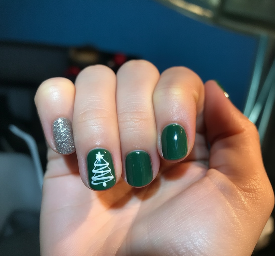 Sometimes the sweetest looks are the simplest ones. These short nails with a deep green polish and a tiny white tree sketch feel cheerful yet understated. The touch of silver sparkle on one nail adds just enough shimmer to catch the light without overpowering the design. It’s a reminder that festive doesn’t always have to mean overcomplicated—it can be minimal and still make a statement.