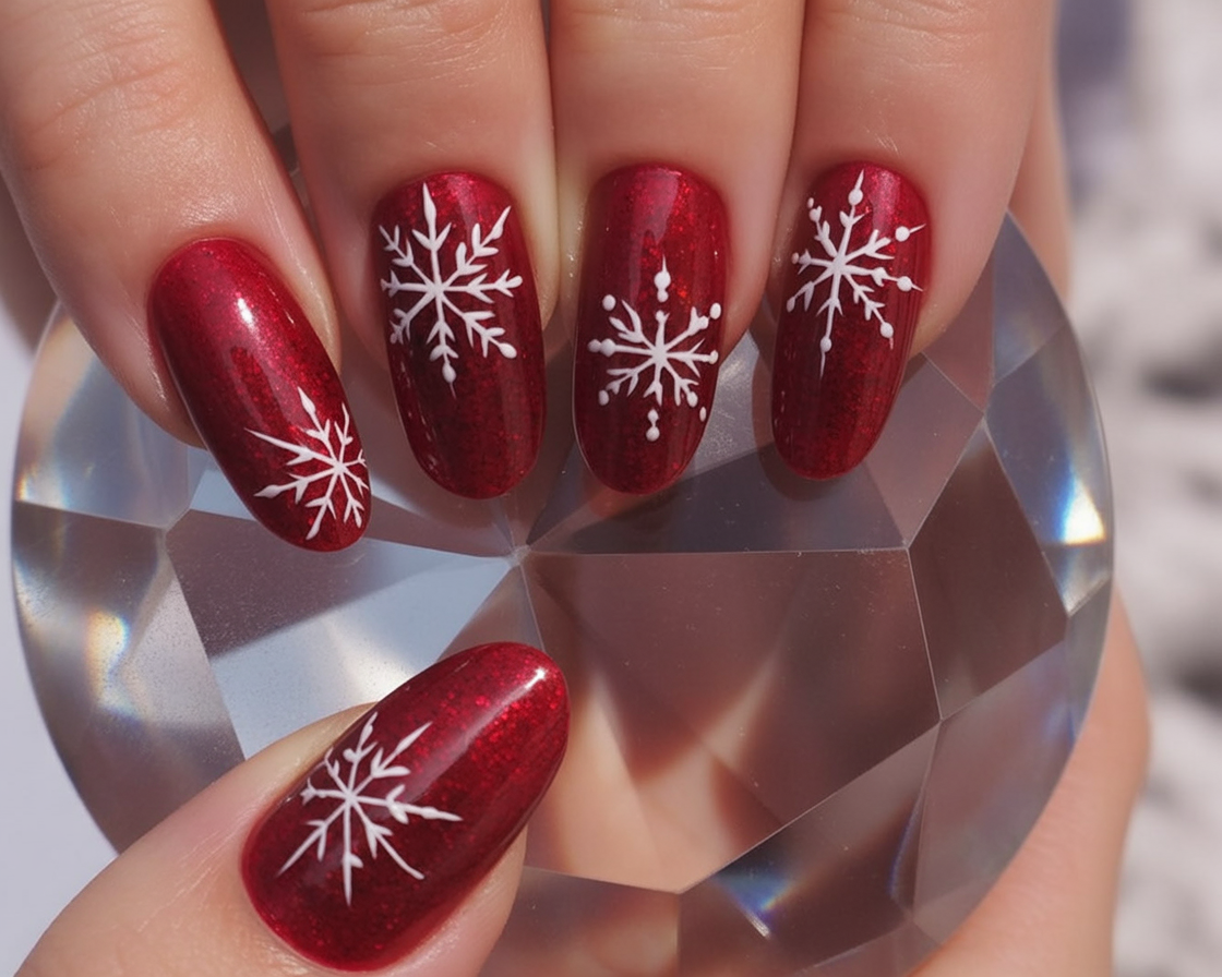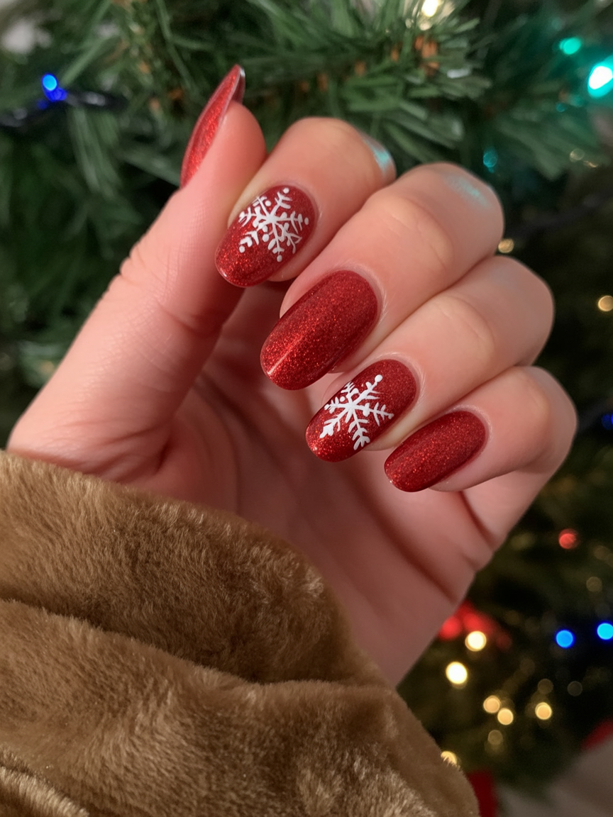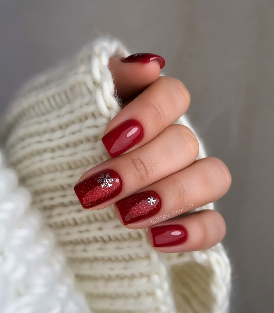 21. Holiday Red Nails with Sparkling Snowflake Designs
