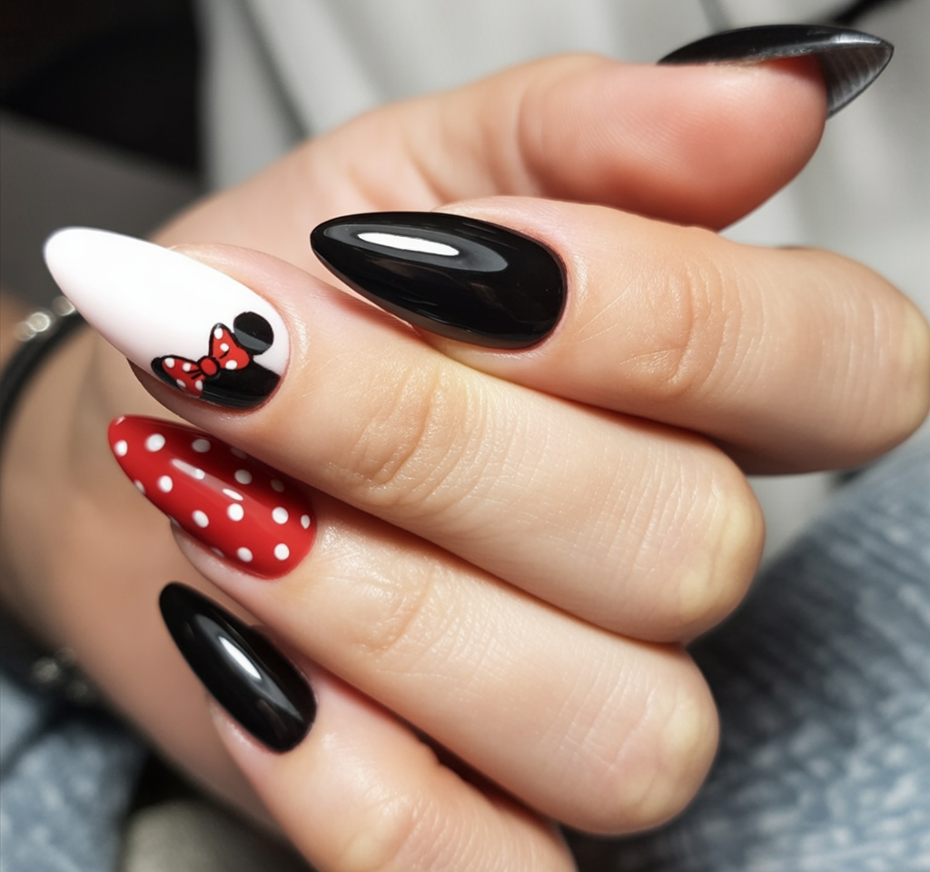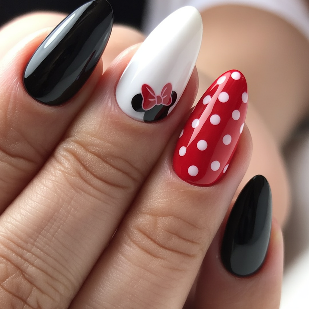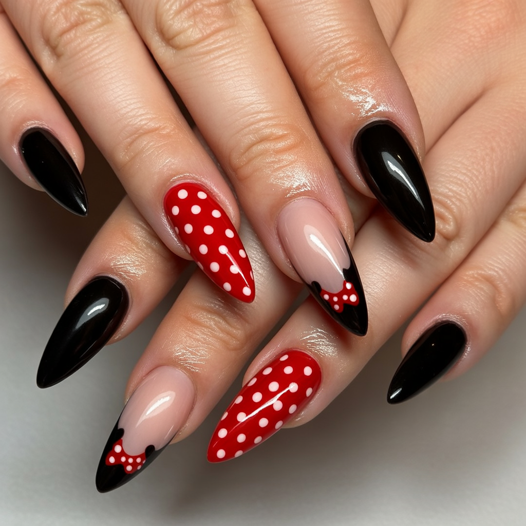 If vintage Disney had a manicure, it would look like this—bold black, cheerful red, and those iconic white dots that say “Minnie” without a word. The almond shape adds a modern twist, while the mix of patterns gives this design a playful, confident attitude that’s impossible not to love.