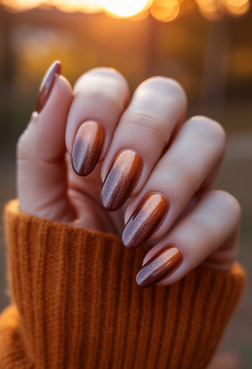 Such copper-colored nail art shines in its warmth and elegance, much like the afterglow that stays back when the sun dips beneath the horizon during fall. The shine has added the perfect dimension to the nail, making it look elegant and contemporary. This nail design instantly boosts your mood—shining, confident, and feminine.