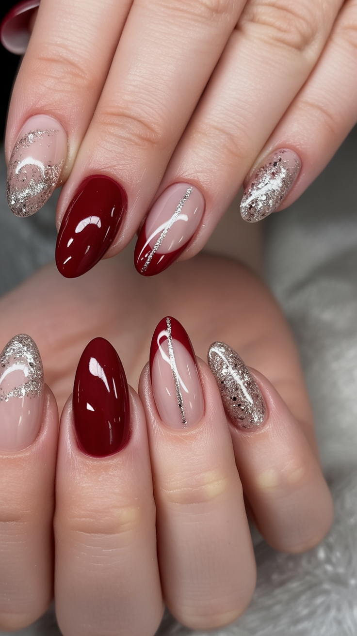 Festive, elegant, and downright Christmas-tacular, these red and silver nail designs are the epitome of Christmas spirit. The shiny red finish paired with the silver glitter nail accent will shine like Christmas lights from any Christmas ornament.