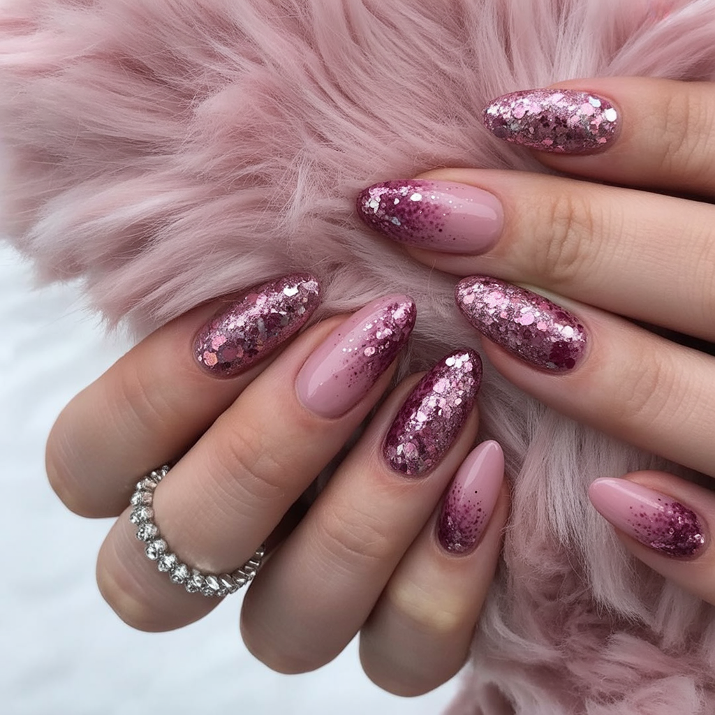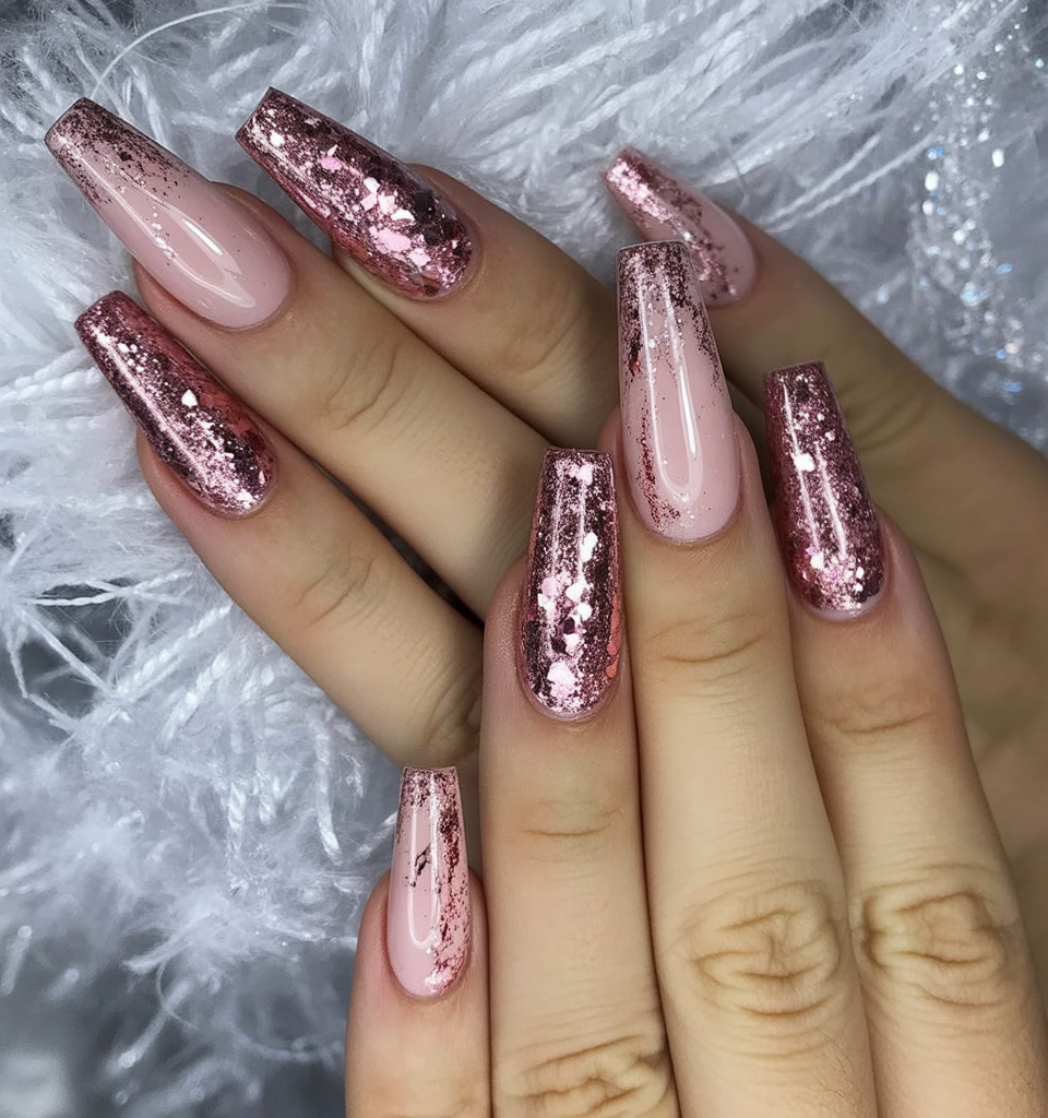 Best for acrylic or gel nail lovers, this design’s subtle fade keeps it classy while the shimmer brings the drama. It’s low-maintenance and easy to pair with anything—from cozy sweaters to evening dresses. The simple inspo mix of neutral pink and shine proves that sometimes, a little glitter goes a long way.